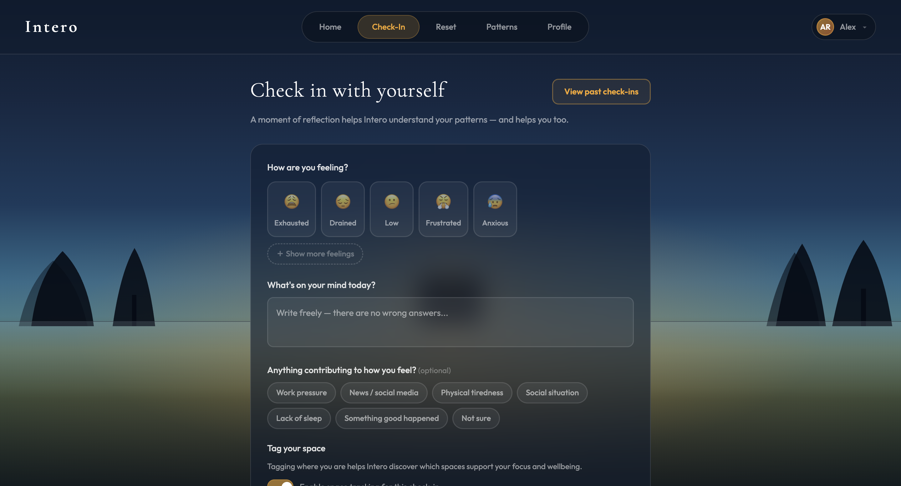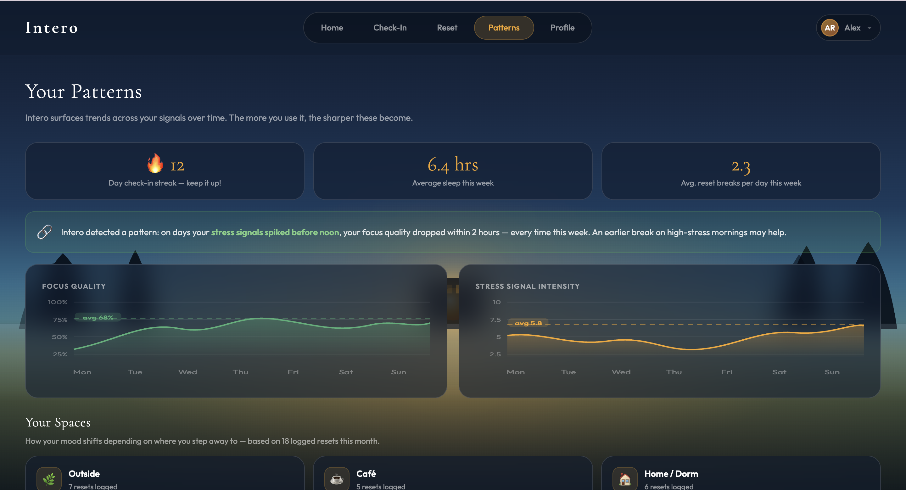 Intero is a web app platform that works by making interoception, the body's internal sense of its own physiological state, visible before it becomes overwhelming. It connects passive behavioral signals to real-time internal state awareness without requiring hardware. Users receive interpreted insight and can prioritize changing their environments based on the suggestions of Intero.