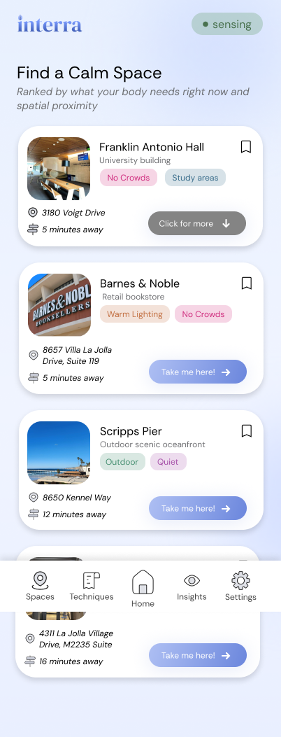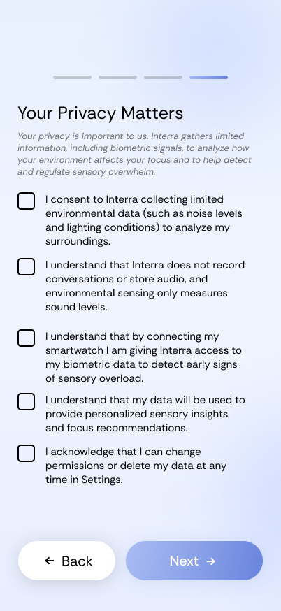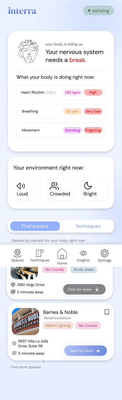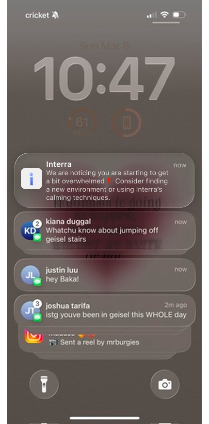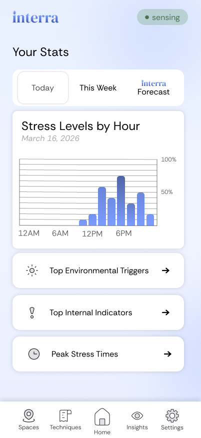Interra combines biometric signals from a smartwatch with environmental cues like noise, crowd density, and lighting to detect early signs of sensory overload. It provides subtle notifications and insights to help users regulate stress, maintain focus, and understand their internal and external environment.