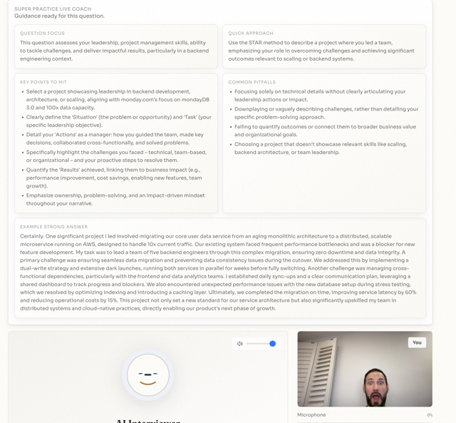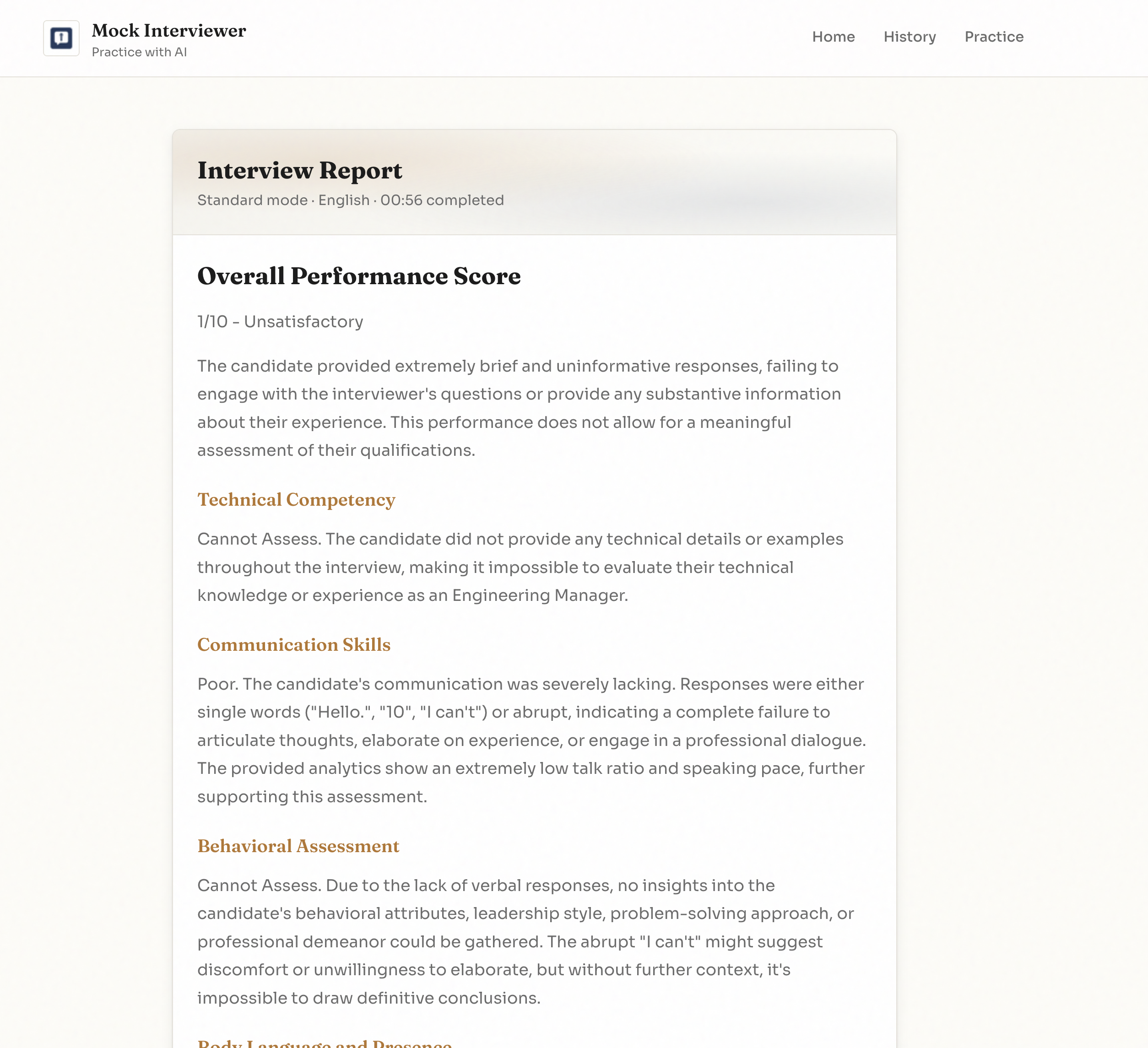 Most interview prep tools still feel like chatbots: text-in, text-out, no pressure, no interruption, and no realistic communication signals. I wanted to build something that feels like a real interview room—where you speak naturally, can be interrupted, and are evaluated on both content and delivery.