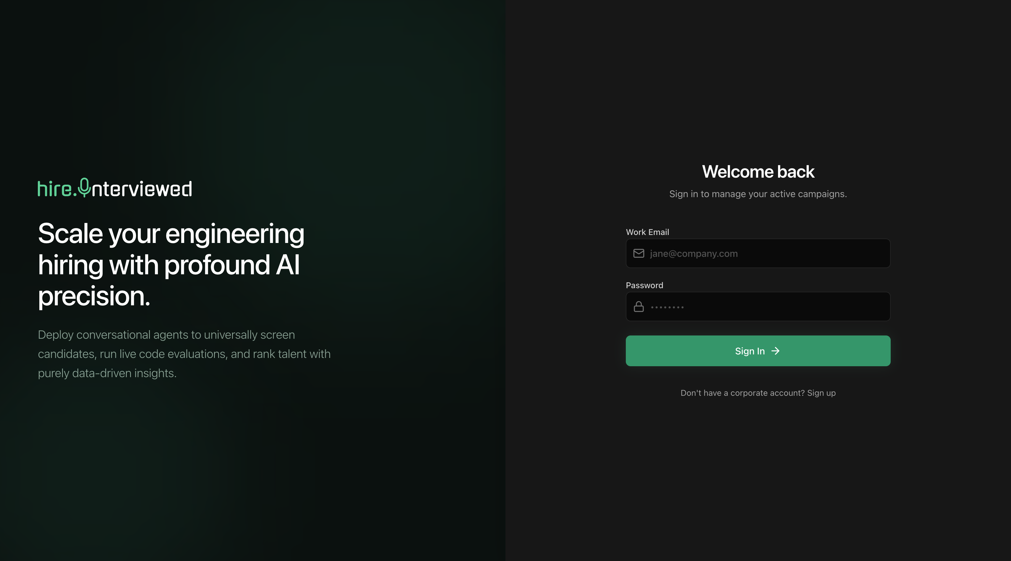 hire.interviewed.space→/hire/*), with job management, candidate pipeline, and detailed evaluation views - Dark theme with custom fonts (DM Sans, Syne, JetBrains Mono), cyan (