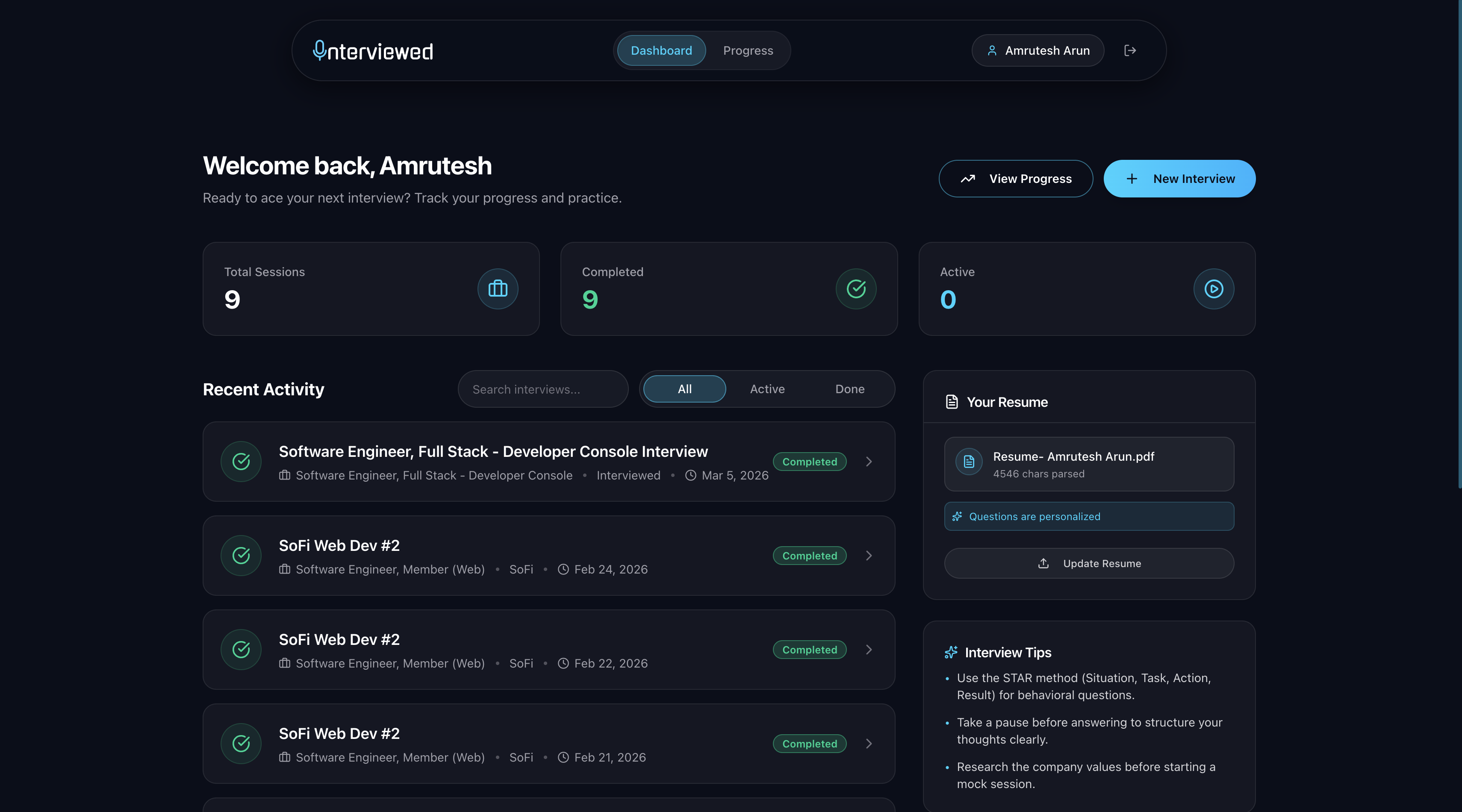Interviewed is a dual-purpose AI interview platform that serves both candidates and recruiters: