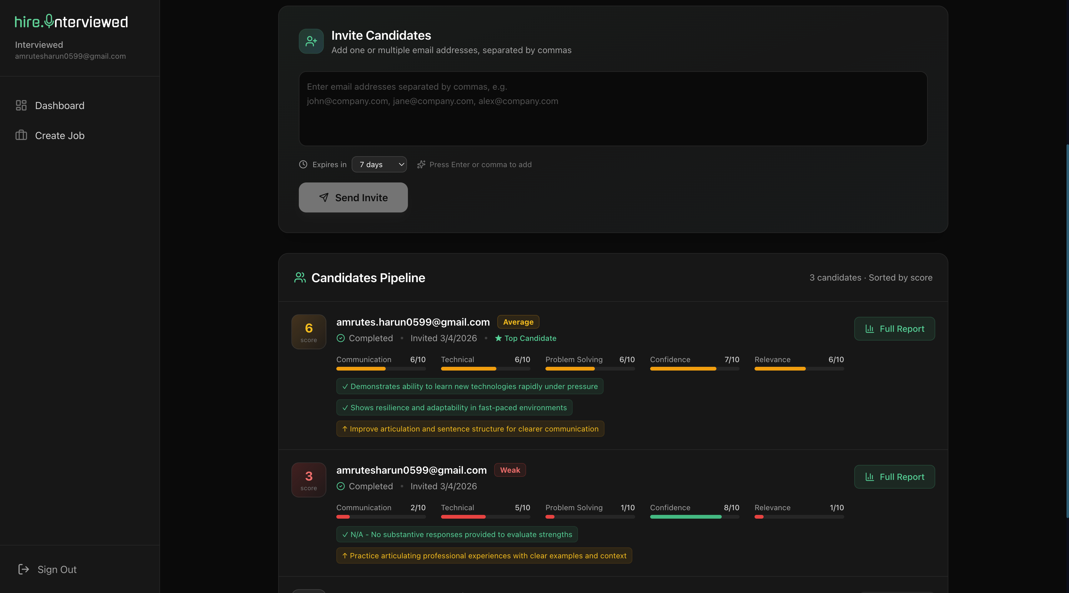 - Live pipeline view - see all candidates ranked by AI scores, color-coded by performance, with detailed evaluation reports and per-question analysis