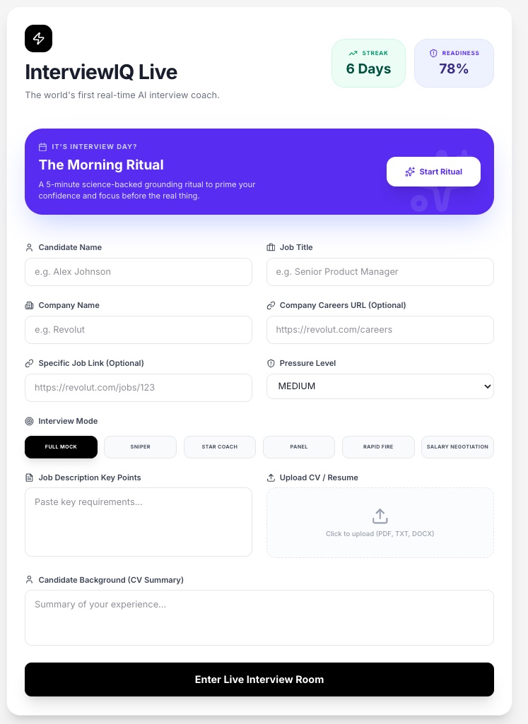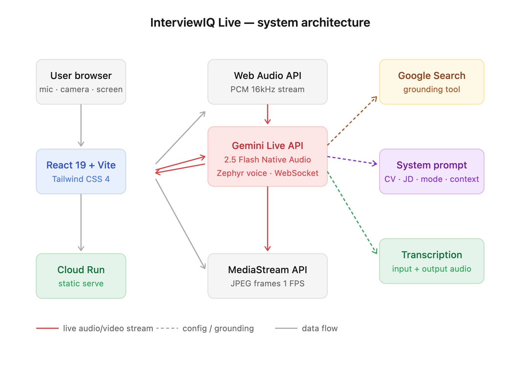 InterviewIQ is a voice-first AI interview coach powered by Gemini Live API. It covers the complete candidate journey — from CV upload to signed offer — across 7 distinct modes: