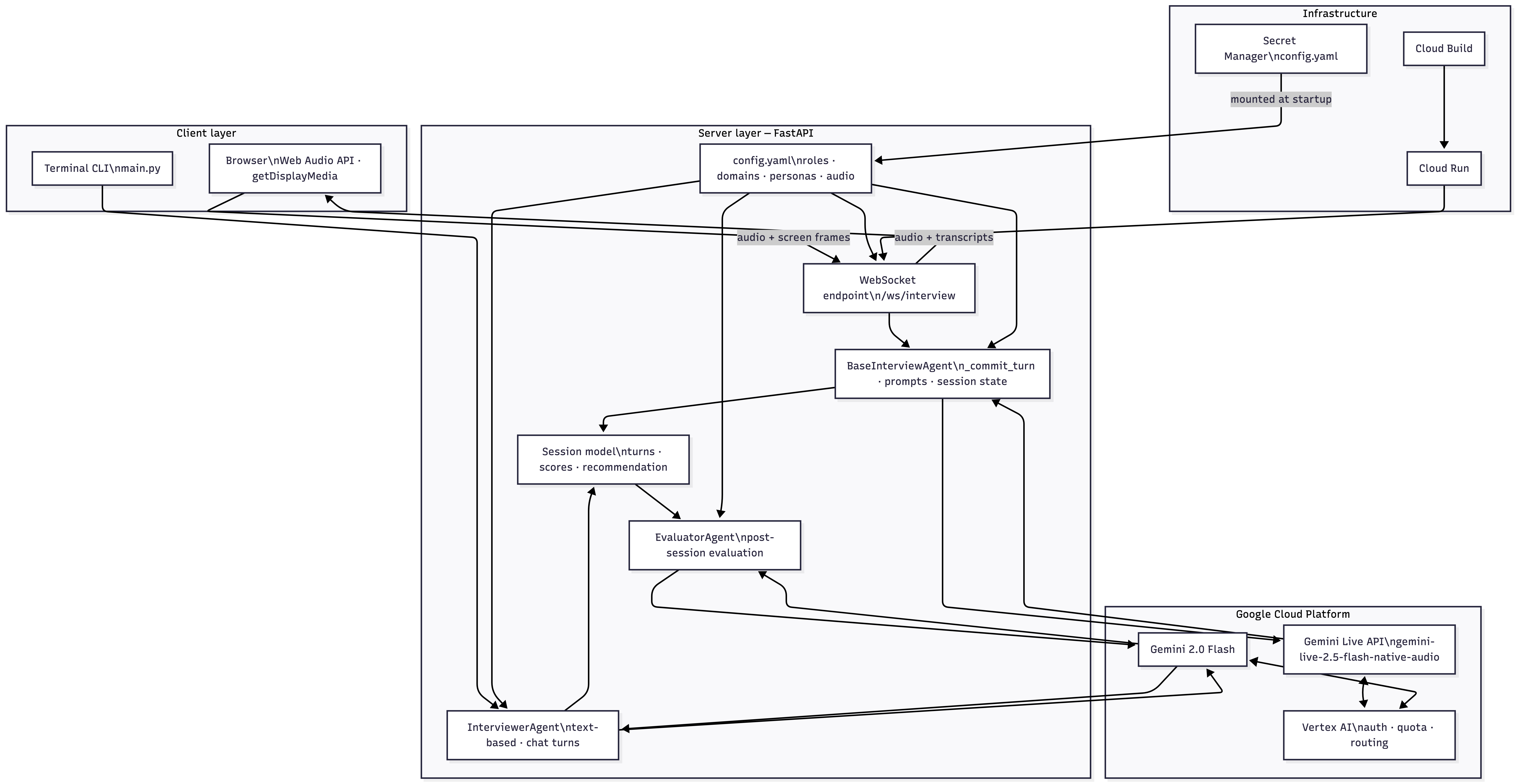 Persistent session storage. Interview transcripts and evaluations currently live only in memory for the duration of the session. The next step is persisting them to Firestore; this gives candidates a full history of past interviews, score trends over time, and the ability to revisit feedback.