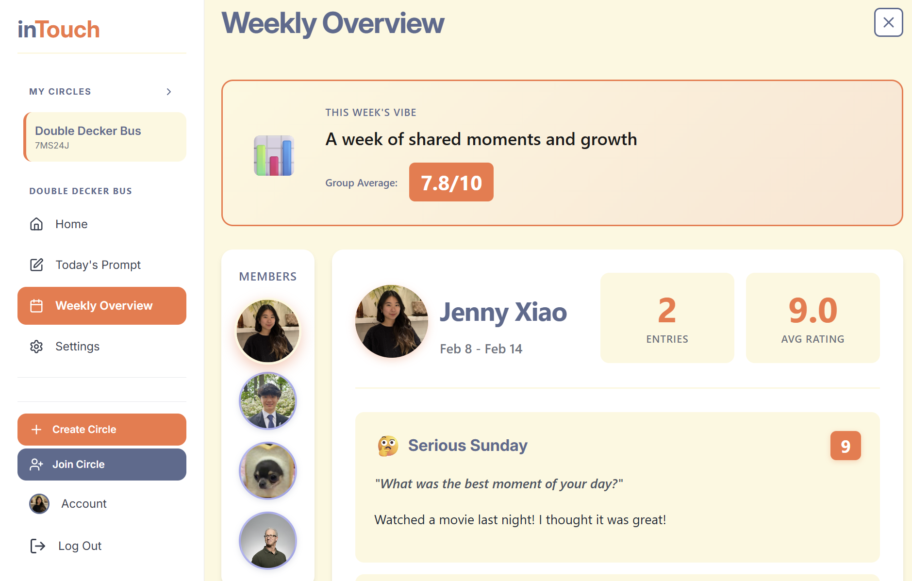 We were inspired by how hard it is to stay emotionally connected with friends, especially old high school friends, once everyone gets busy. Texting feels shallow, social media is noisy, and journaling is often a solo habit that never leaves your notes app. We wanted to build something that sits in between a calm space where reflection and connection. inTouch was born from the idea that small, intentional check-ins can make people feel genuinely seen.