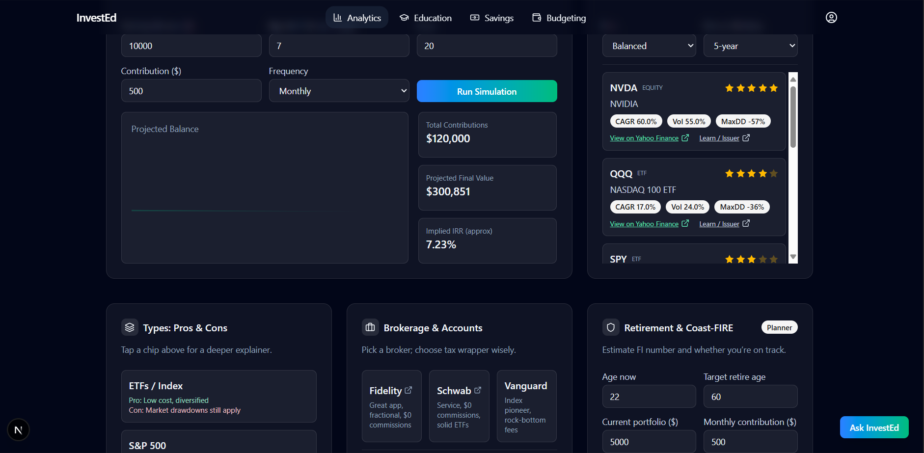 • Lets users compare S&P 500, ETFs, index funds, crypto, and tech stocks.
