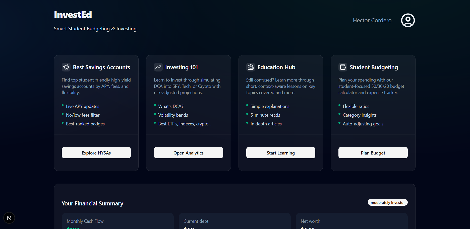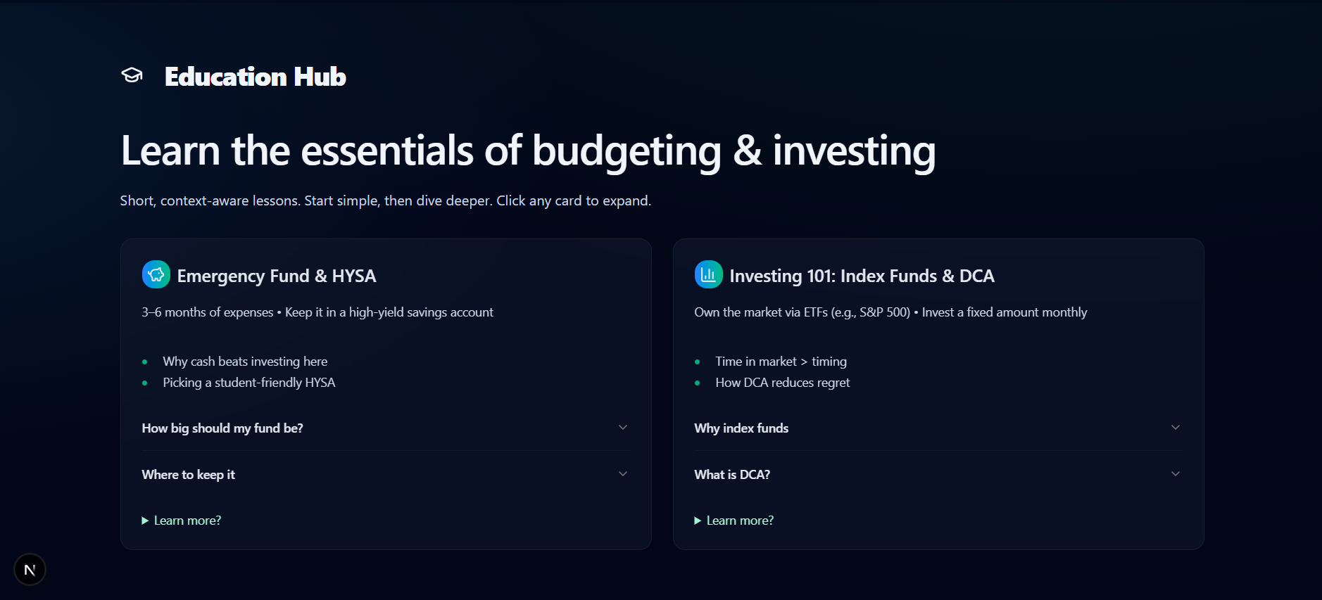 Most students want to manage their money better, but personal finance feels overwhelming, fragmented, and full of jargon. Traditional budgeting apps show where your money went, but not what to do next. Investing platforms assume you already understand emergency funds, APY, ETFs, Roth IRAs, and compound interest, which most students were never taught.