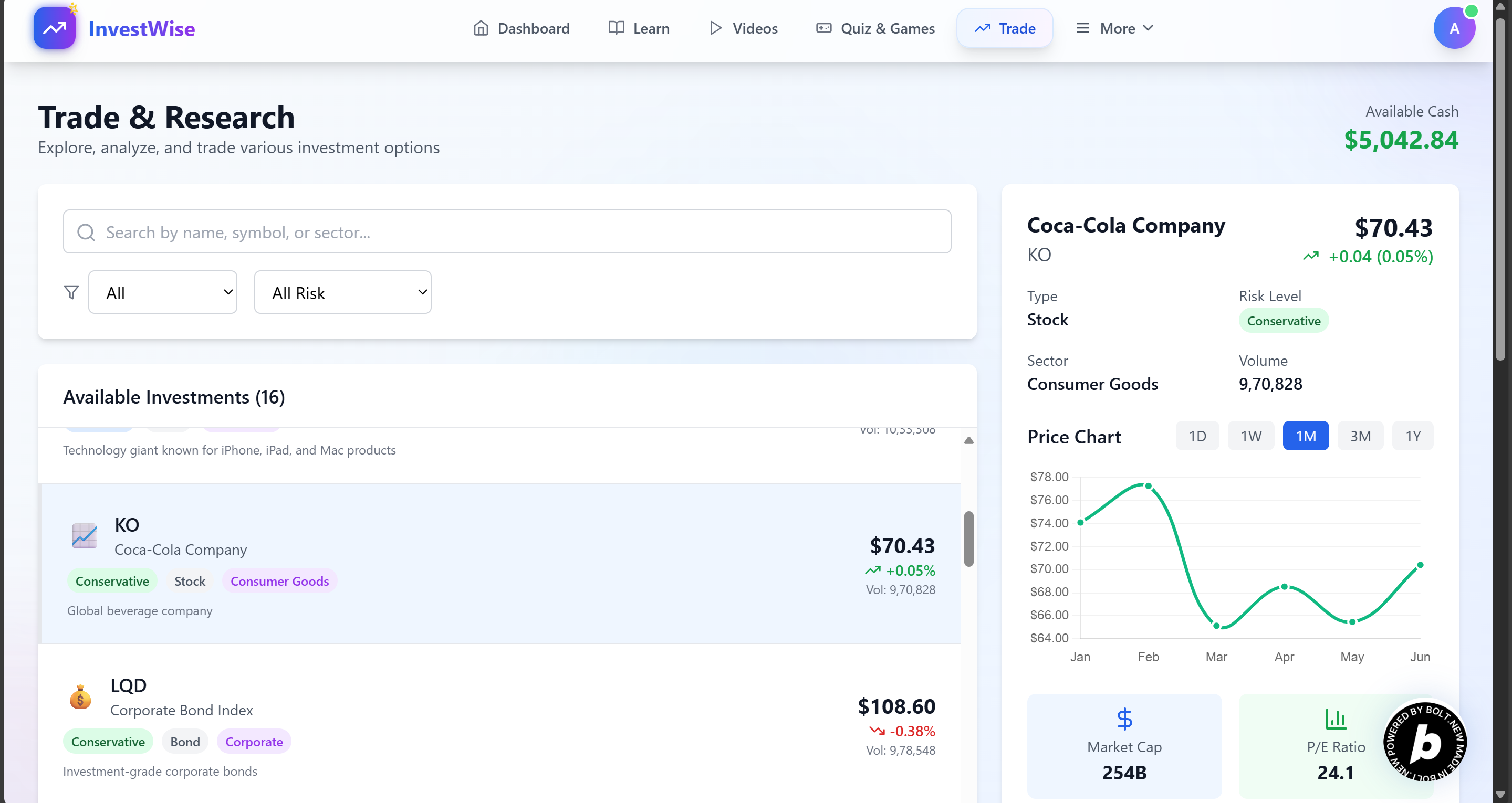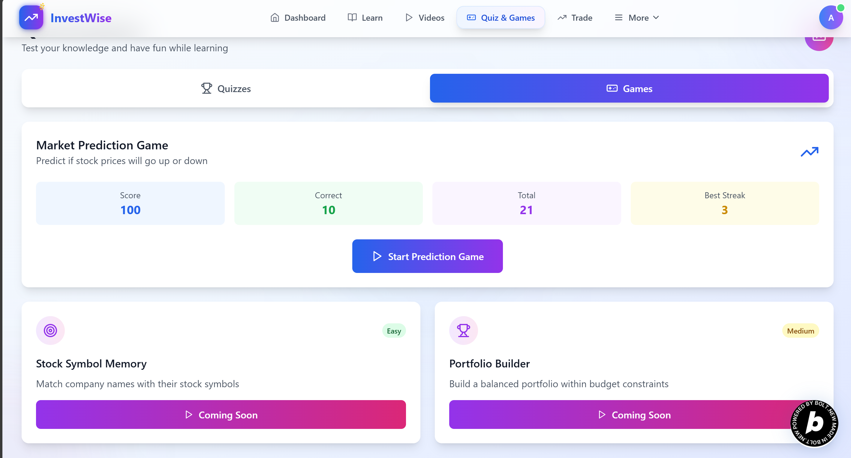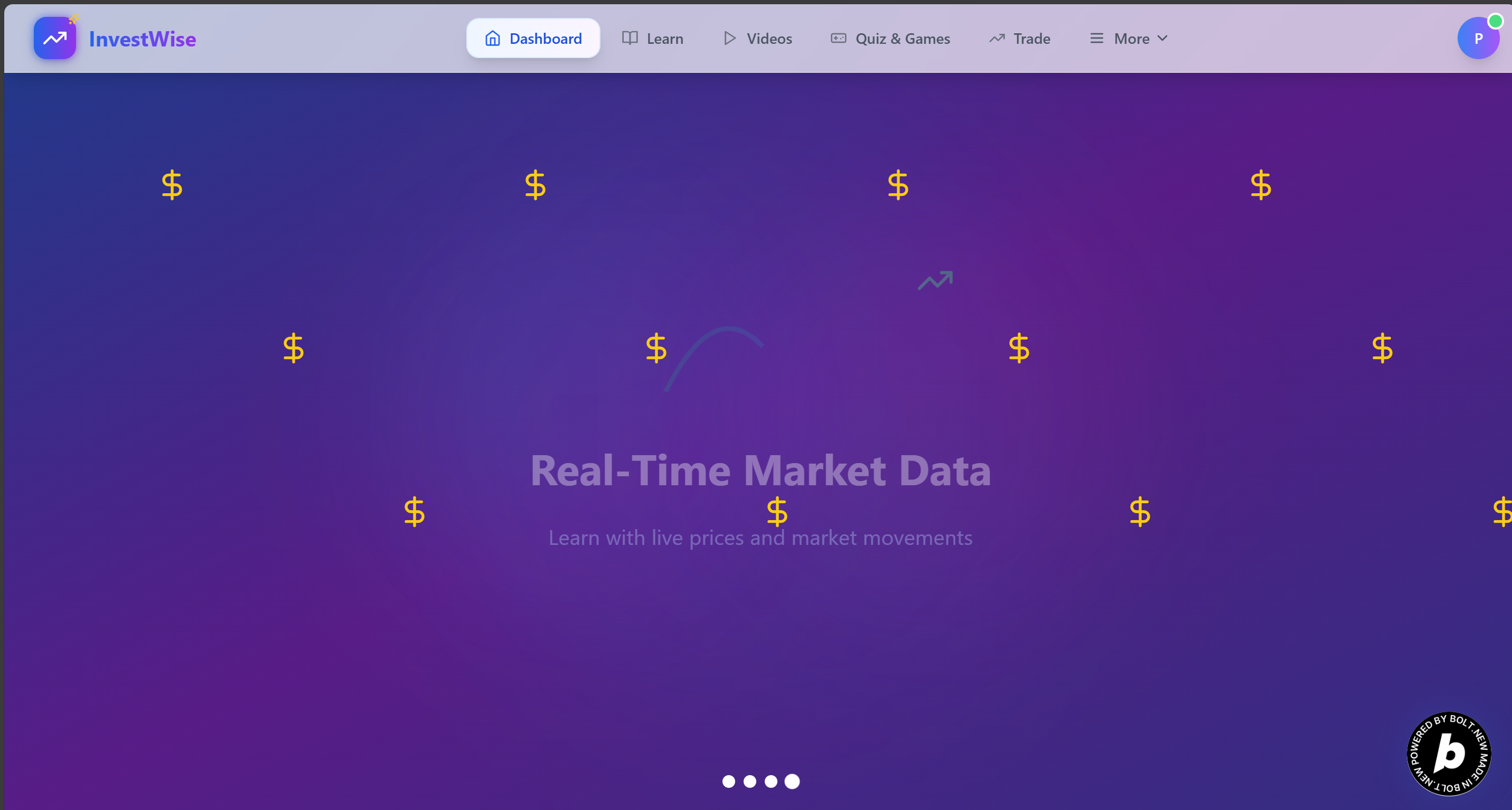 InvestWise is a gamified investment simulator built primarily using Bolt.new, designed to help users learn stock trading through an interactive, goal-oriented experience. Users start with virtual cash, explore a dynamic stock market with real-time price simulation, and build a portfolio while unlocking achievements and tracking performance.
