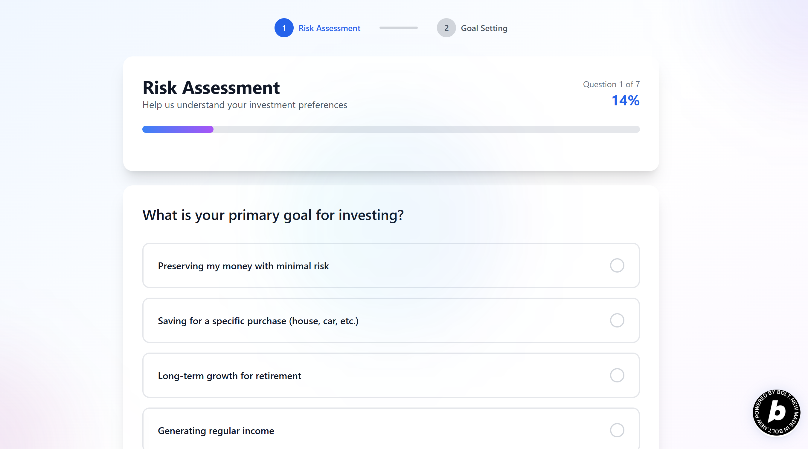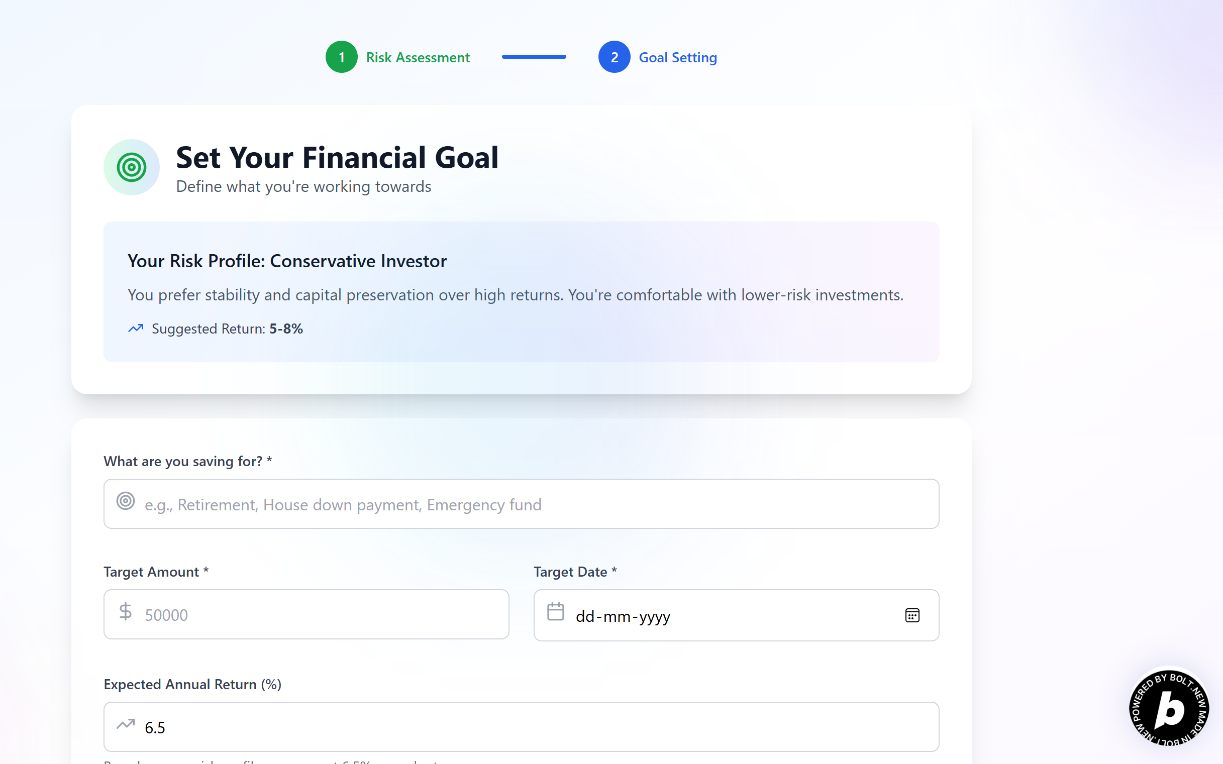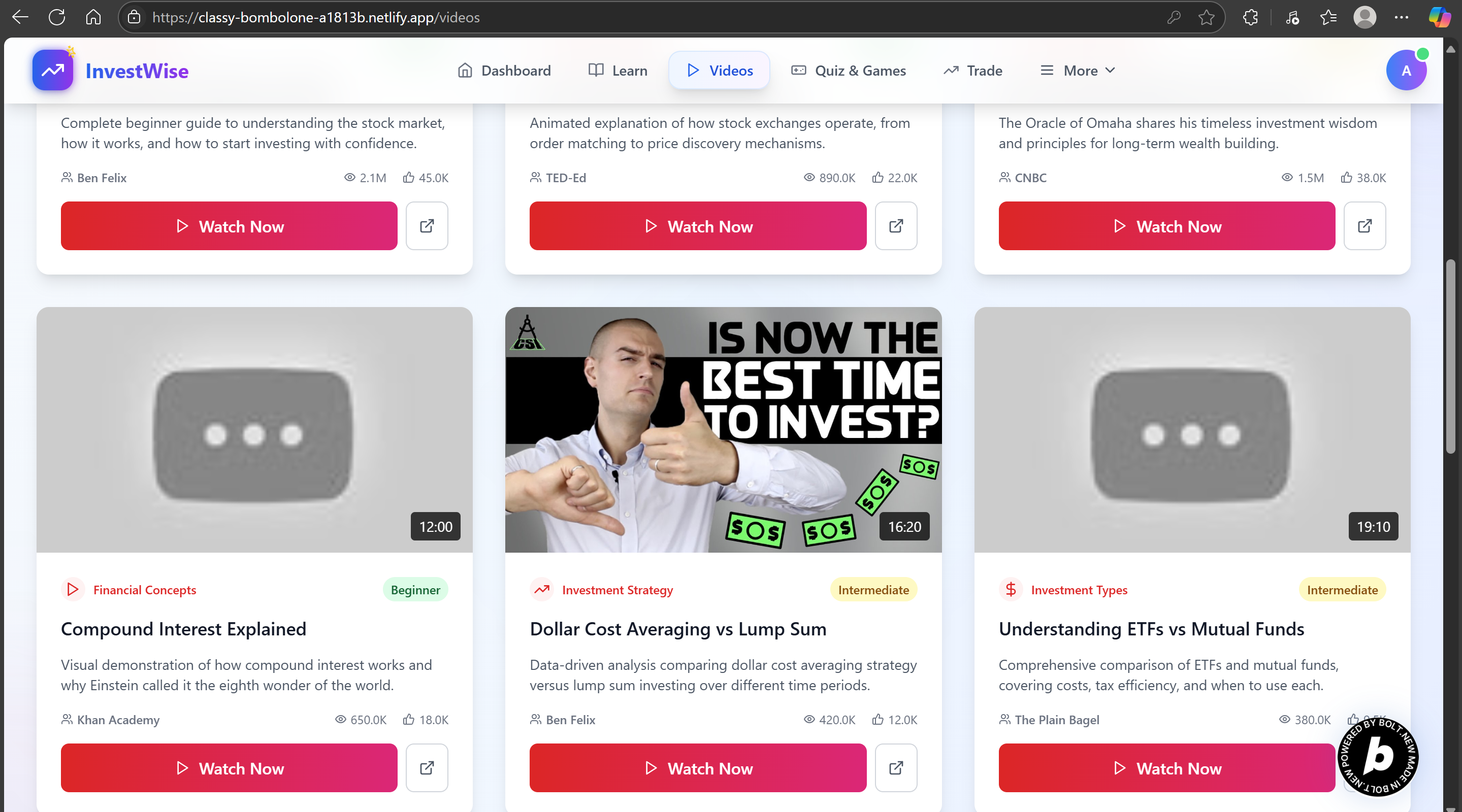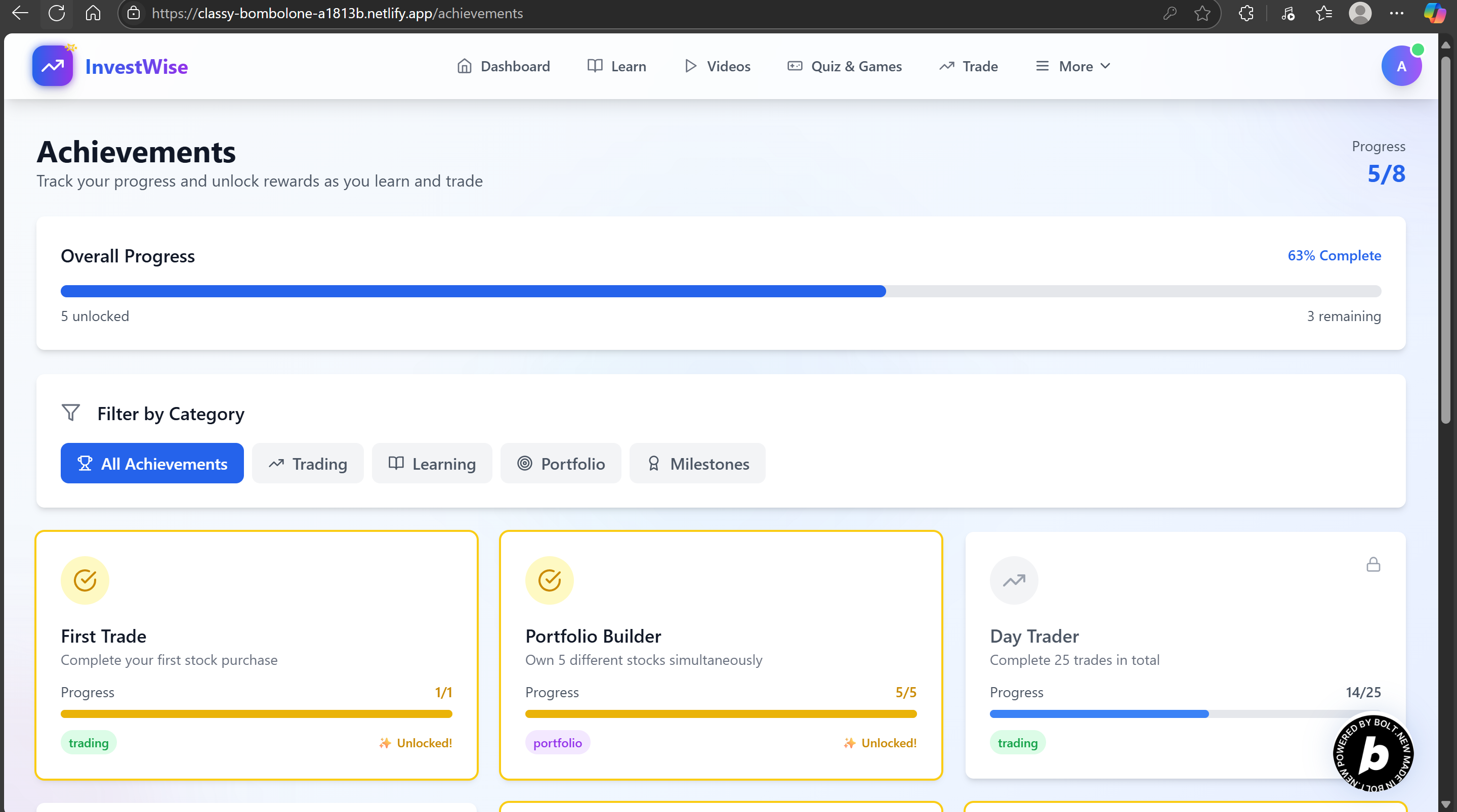 InvestWise is a gamified investment simulator built primarily using Bolt.new, designed to help users learn stock trading through an interactive, goal-oriented experience. Users start with virtual cash, explore a dynamic stock market with real-time price simulation, and build a portfolio while unlocking achievements and tracking performance.