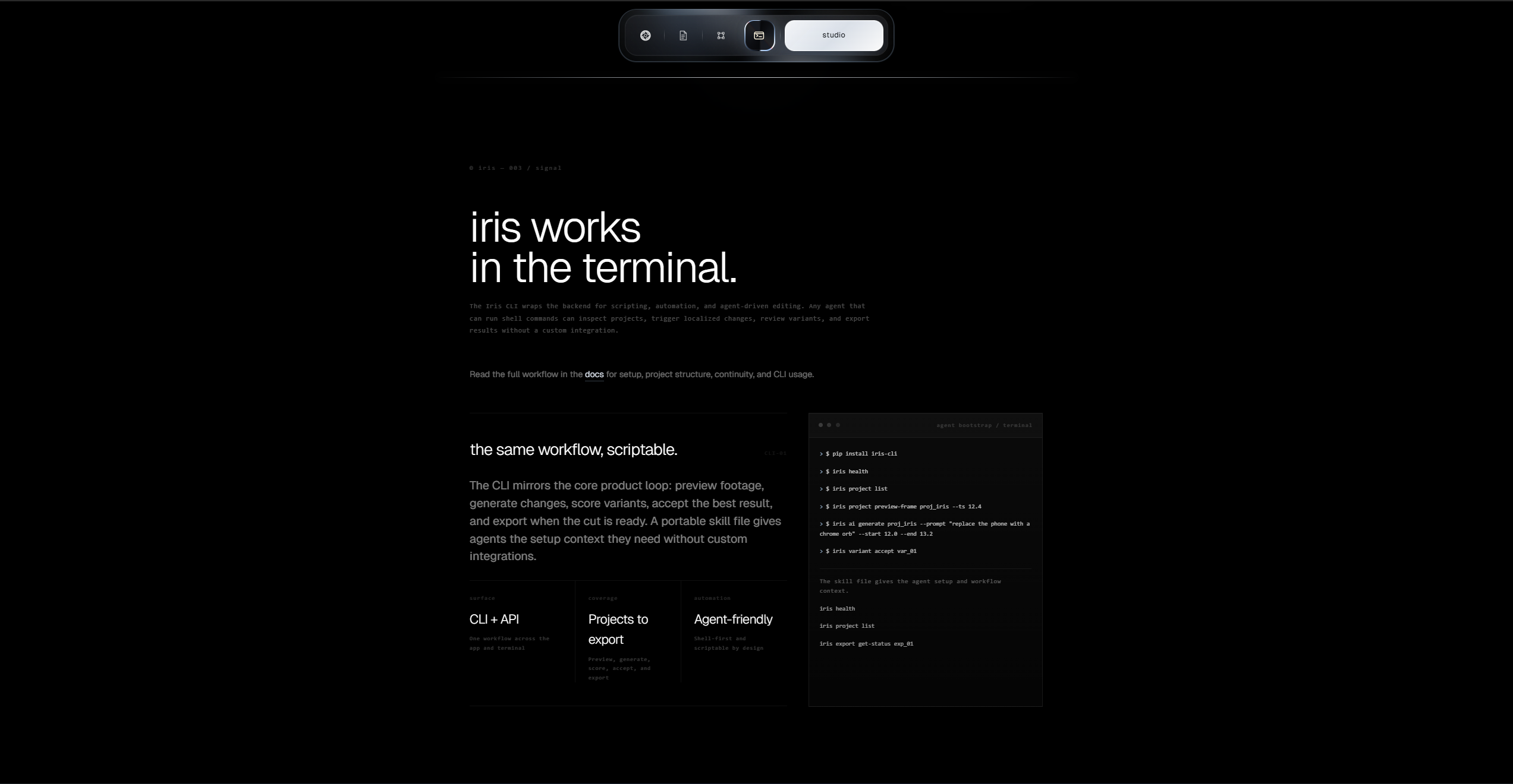 fully autonomous video editing. our SKILL.md teaches any AI agent how to drive the iris CLI. we tested it with Claude Code: tell it "make this video look cinematic" and it runs iris analyze, reads the scene breakdown, identifies edit opportunities, runs iris generate with tailored prompts, scores the results, and accepts the best variants. no human in the loop.