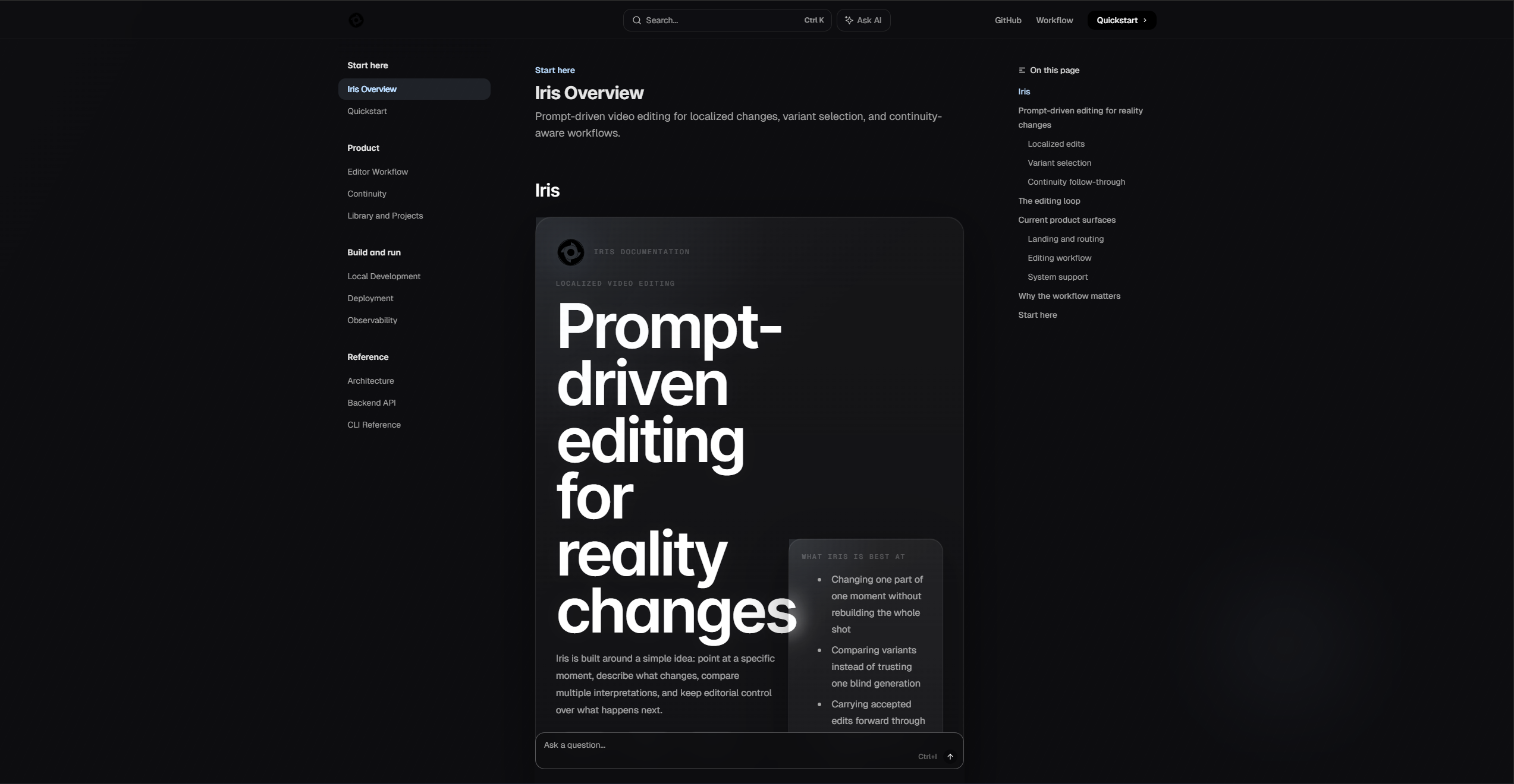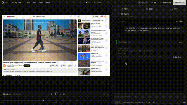 iris is three systems: a React editor that feels like premiere but thinks like an agent, a FastAPI backend that orchestrates multiple AI models into one coherent pipeline, and a CLI that lets any AI agent edit videos autonomously.
