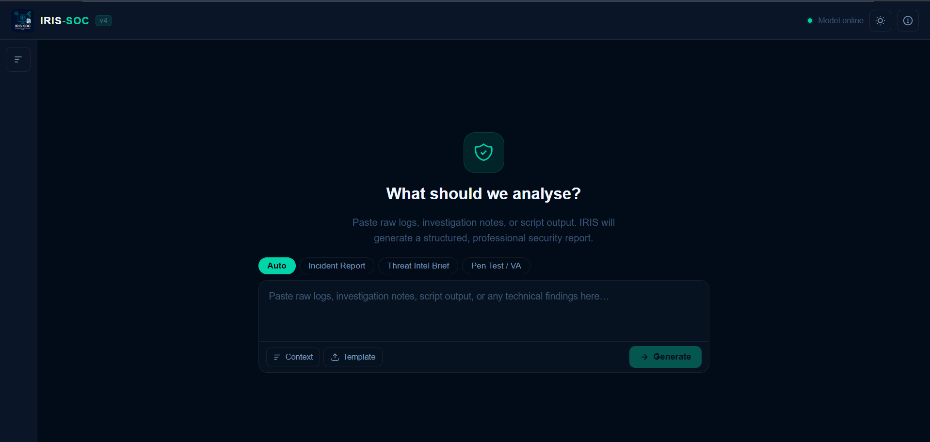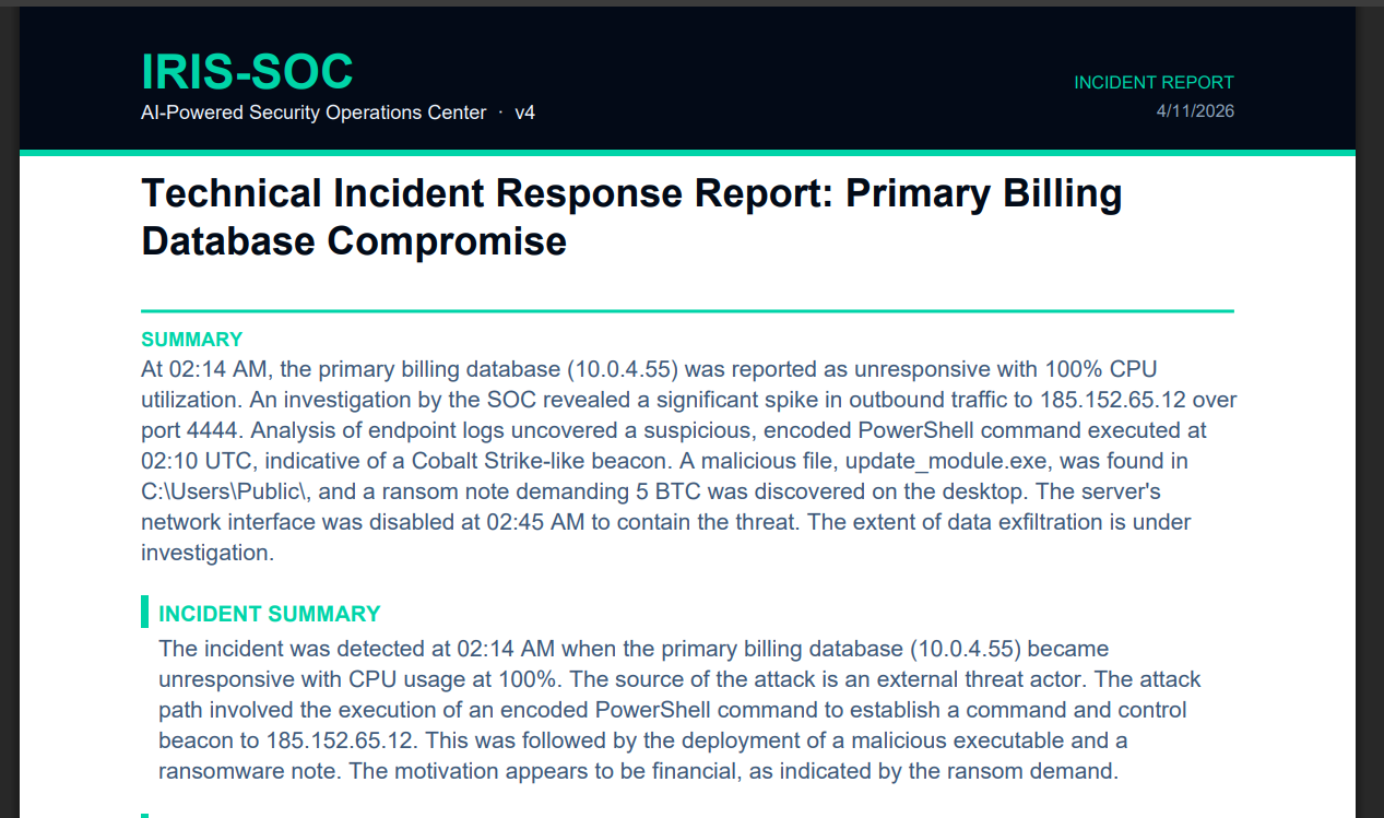 Every day, cybersecurity analysts face a massive bottleneck: the blank page. When an attack happens, logs flood in, and evidence scatters across a dozen tools. Before anything can be escalated or acted upon, a highly skilled security professional has to spend 2–4 hours manually formatting a document. For smaller organizations, NGOs, and under-resourced security teams especially across Africa this isn't just an administrative annoyance, it’s a dangerous gap in response time that attackers exploit. We built IRIS-SOC because professional reporting shouldn't be a privilege reserved for massive enterprise teams. We wanted to turn raw chaos into actionable, standardized intelligence in seconds, allowing analysts to get back to what they do best: hunting threats.
