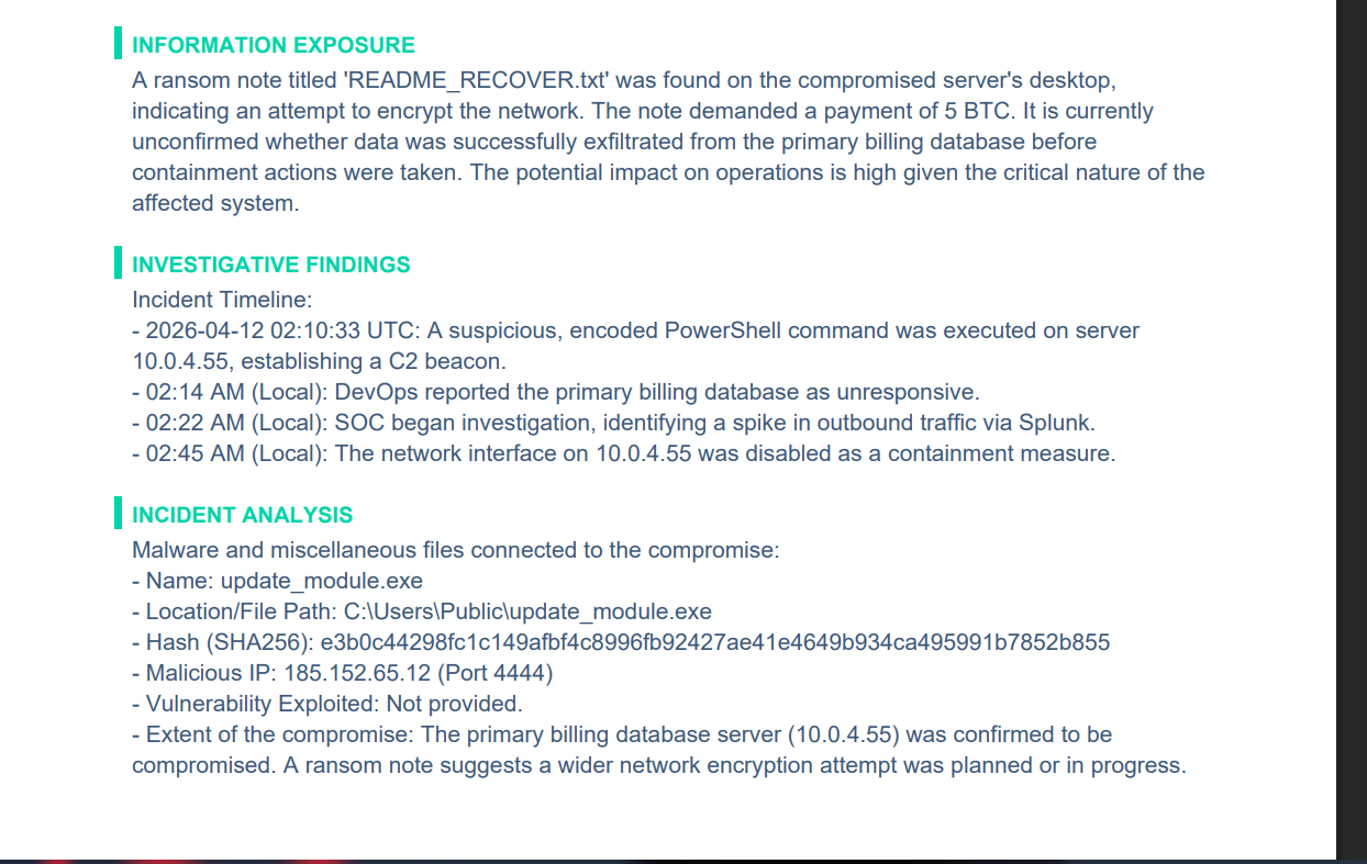 Our biggest hurdle was ensuring technical precision. Most AI generators summarize or paraphrase text, which is catastrophic in cybersecurity. If an AI alters a CVE number, an IP address, or a file hash, the report becomes useless or worse, misleading. We had to rigorously prompt-engineer and structure our Gemini API calls to ensure it acted as a strict parser rather than a creative writer. We trained the system to preserve technical indicators exactly as entered and to gracefully output "Not provided" when data was missing, prioritizing integrity over the appearance of a "complete" document. Handling the massive variance in unstructured log formats was also a significant parsing challenge that required extensive iterative testing.