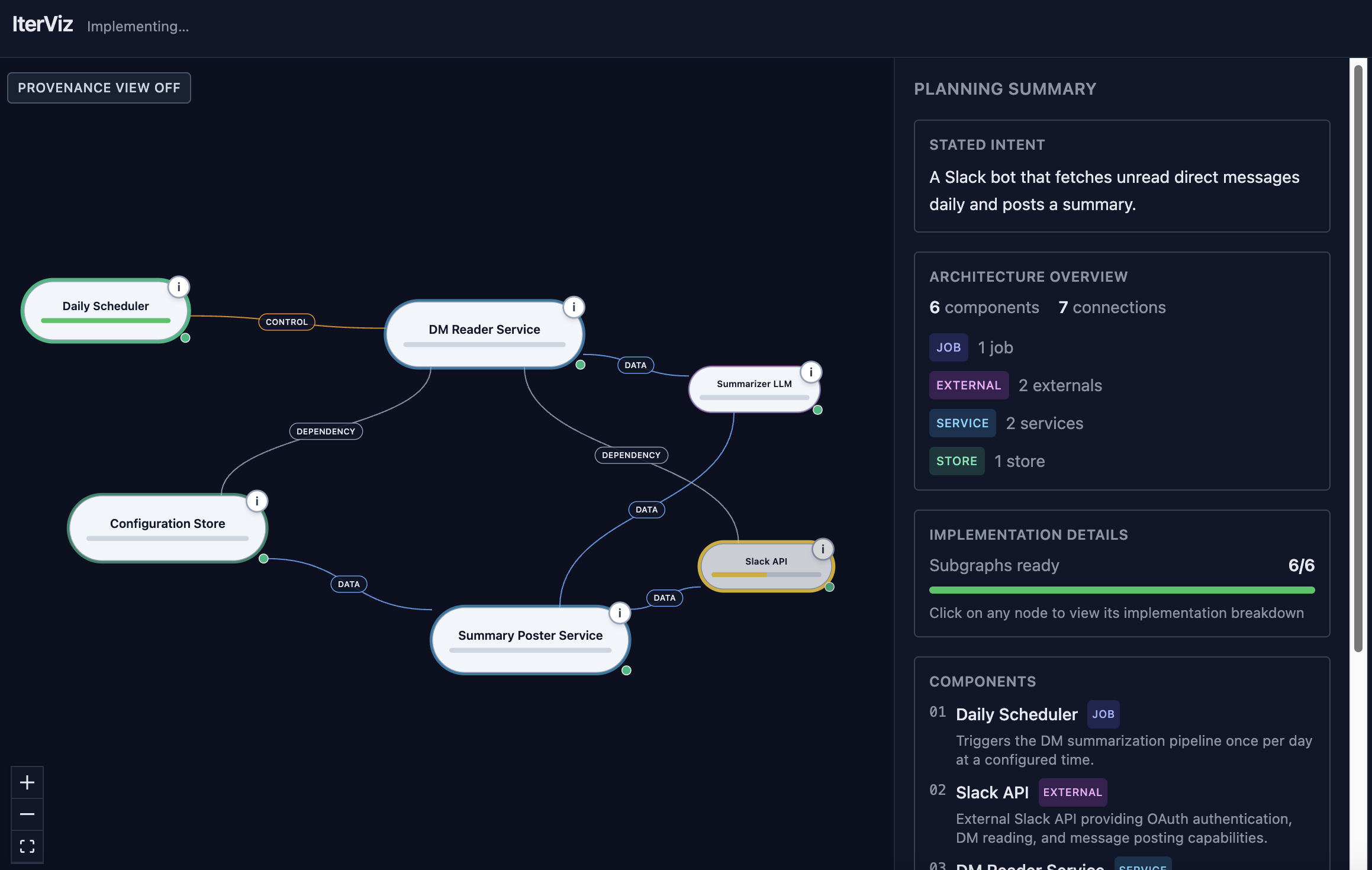 At its core, IterViz creates a visual orchestration layer between you and AI coding agents. Instead of walls of text, you get an interactive architecture graph that shows exactly what the agent plans to build.
