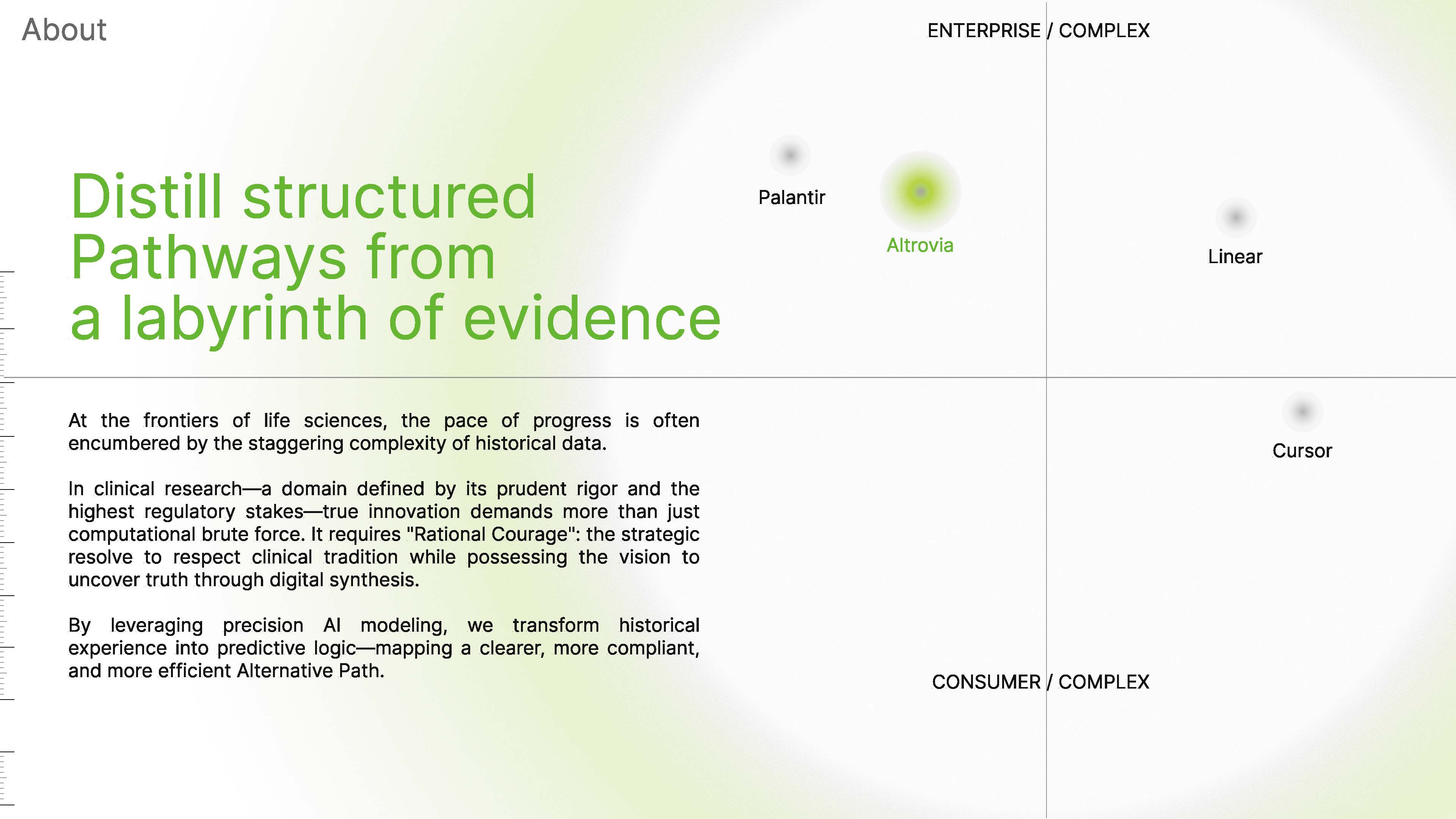 Our branding system, "The Distilled Pathway," transforms the overwhelming complexity of clinical evidence into a clear, actionable visual language. We developed a symbolic framework that represents "Rational Courage": the ability to respect rigorous clinical standards while leveraging precision AI modeling to extract predictive logic.