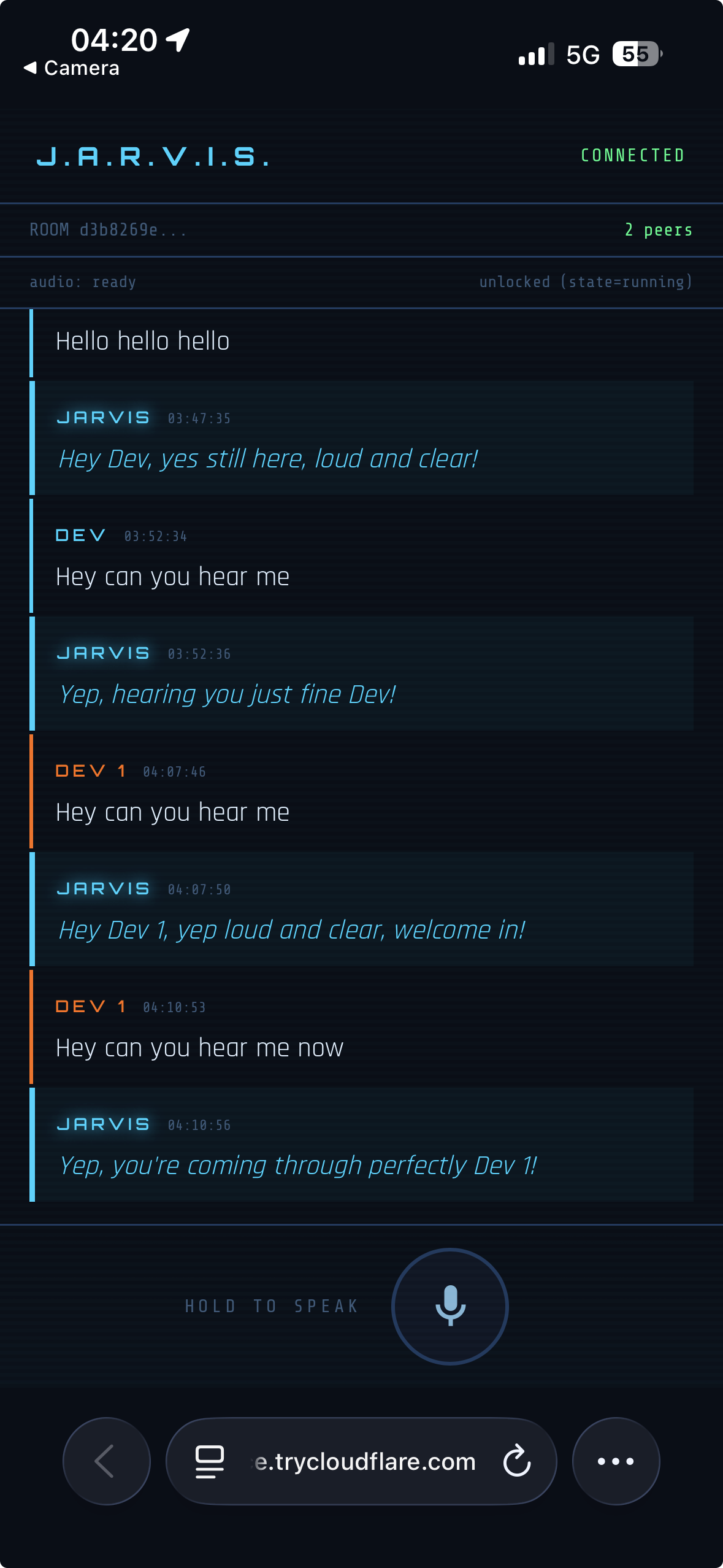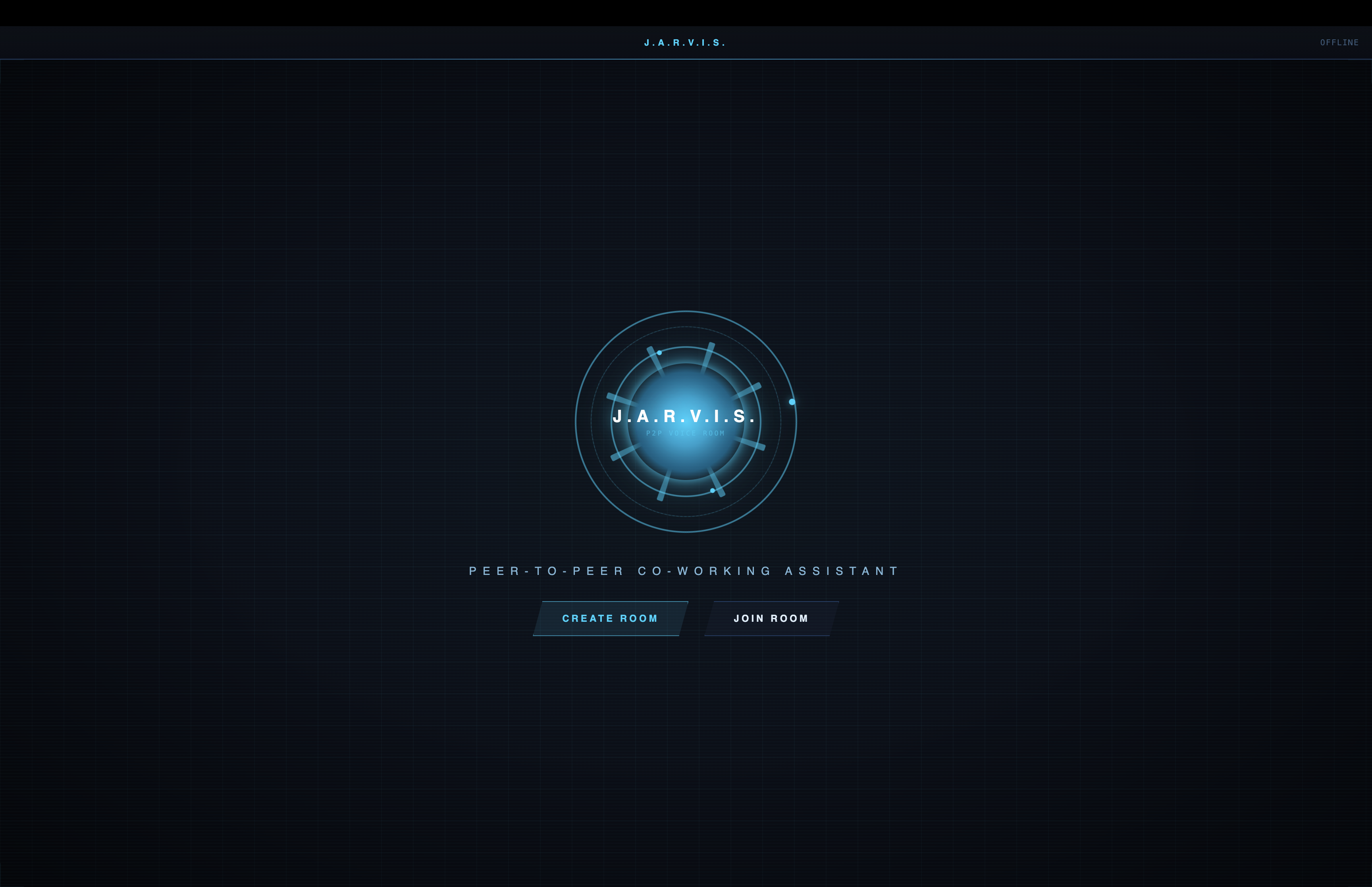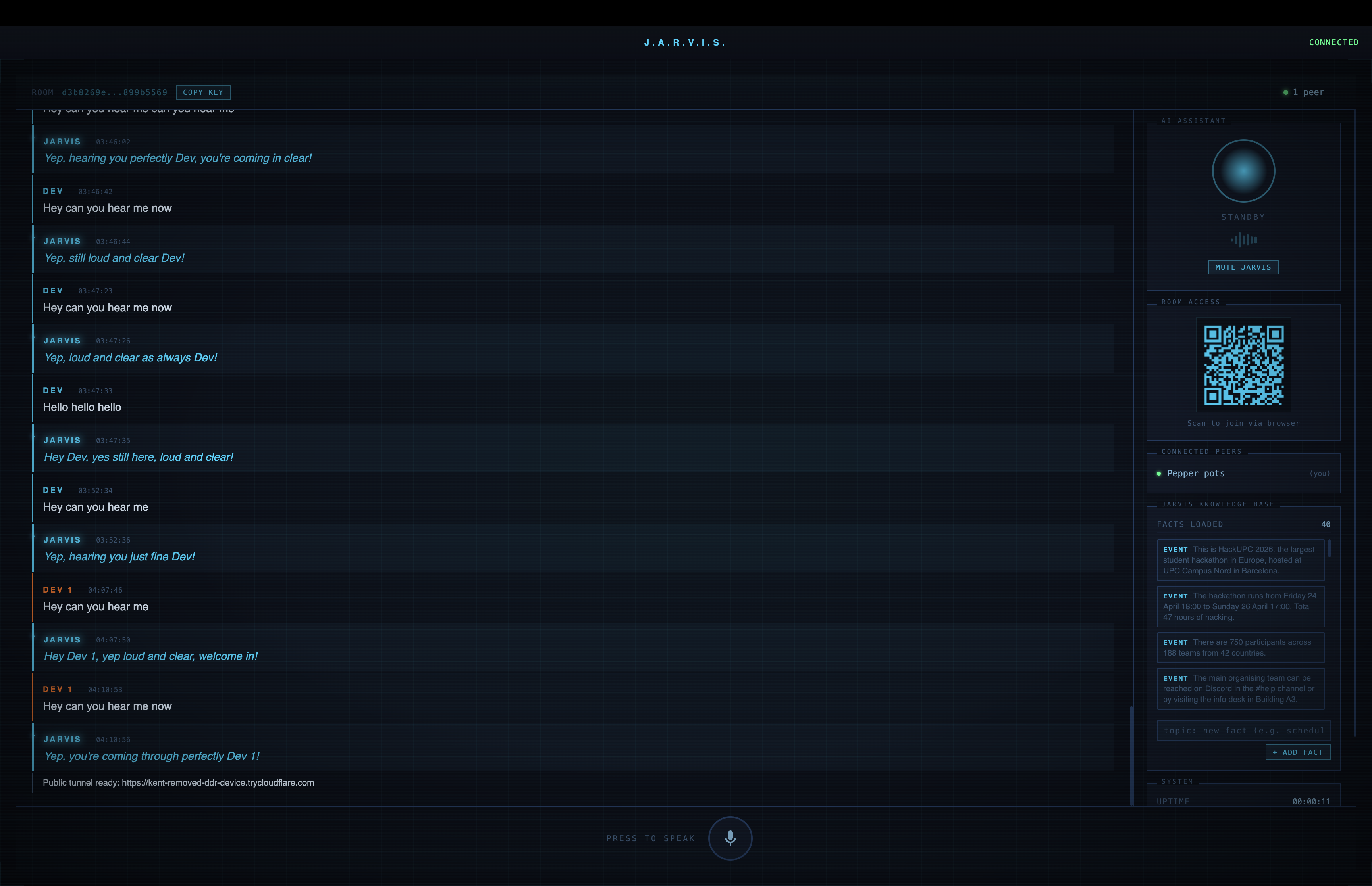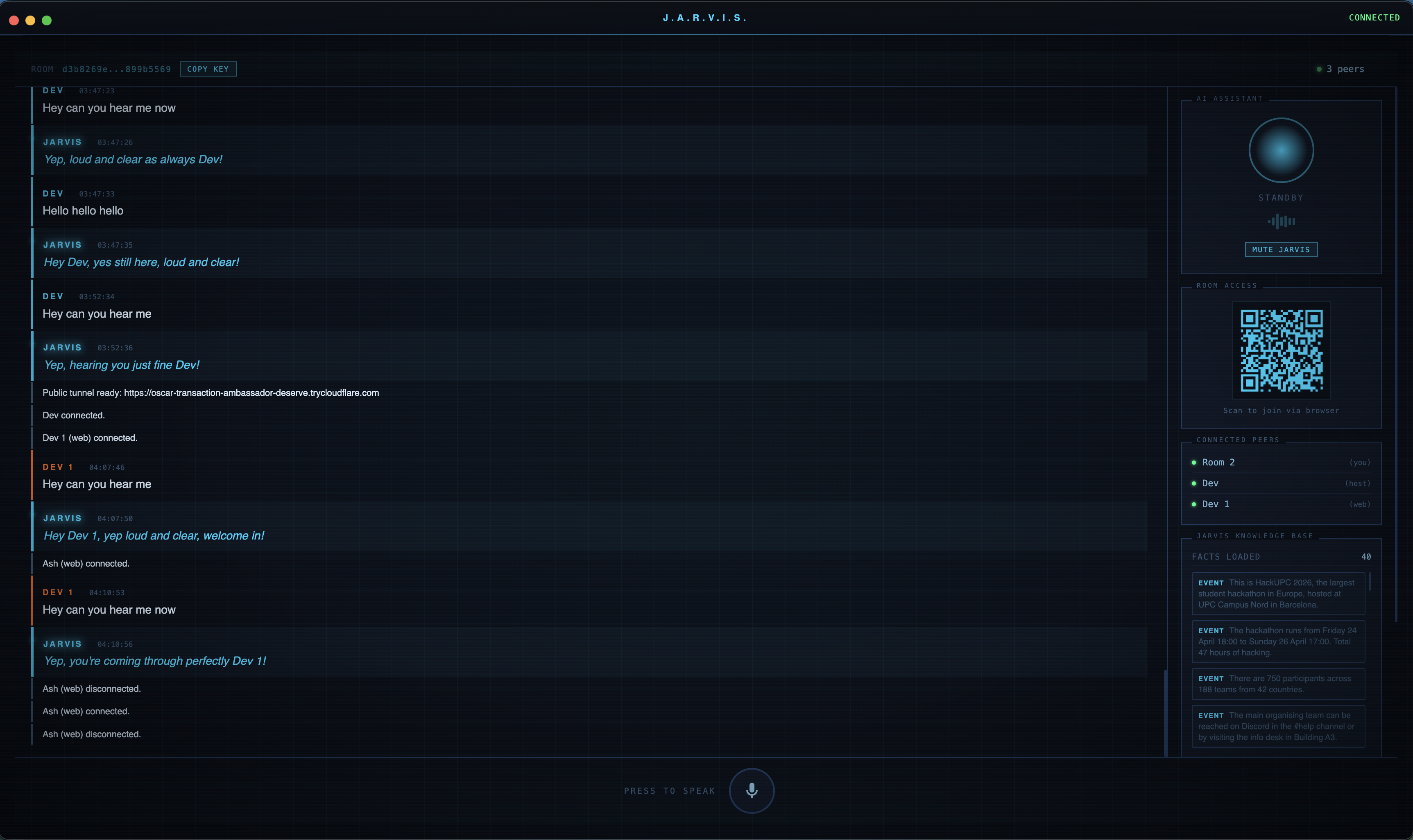 Jarvis is a peer-to-peer meeting room with a built-in voice AI. Two laptops and a phone join the same room with a QR code, talk to each other live, and get a shared transcript that lives only on the devices that were actually in the call. Say "hey jarvis" and the AI joins the conversation, answers out loud, and remembers context just like a human peer would.
