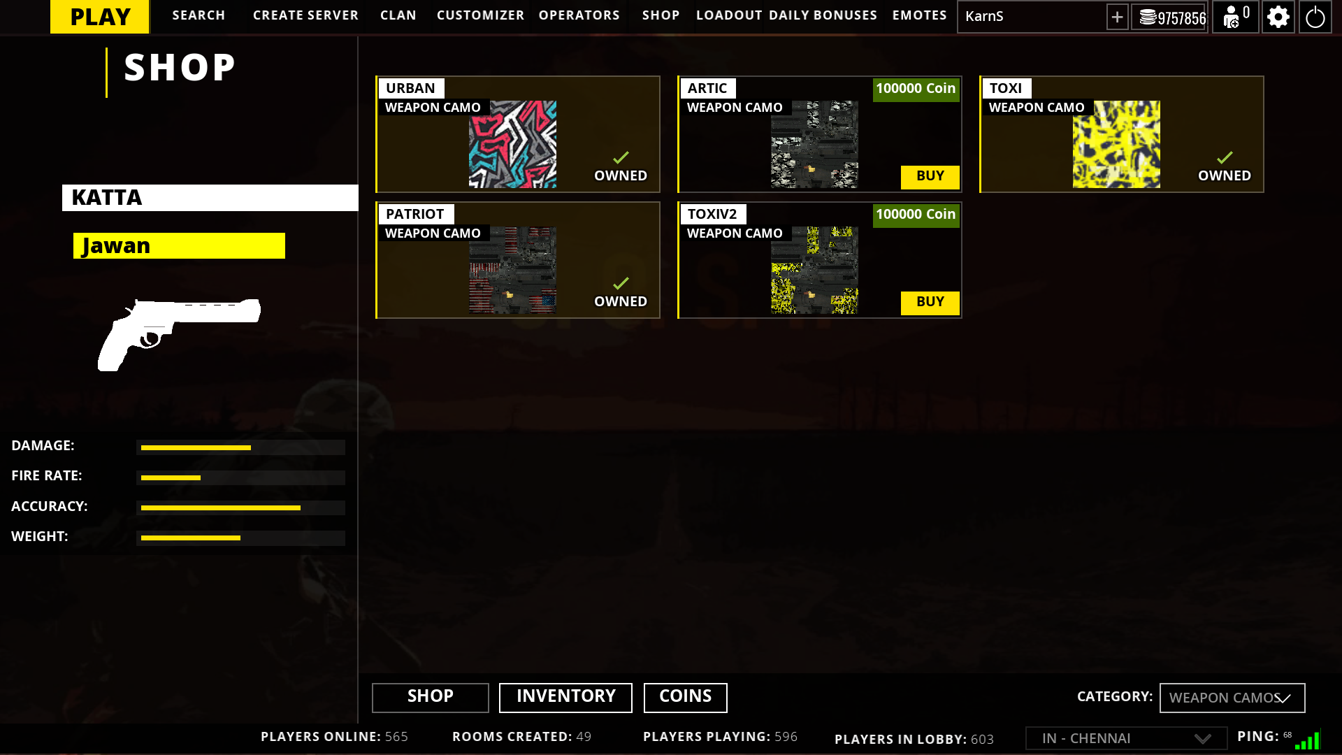 Loadout (where purchased and earned weapons can be chosen for battle)