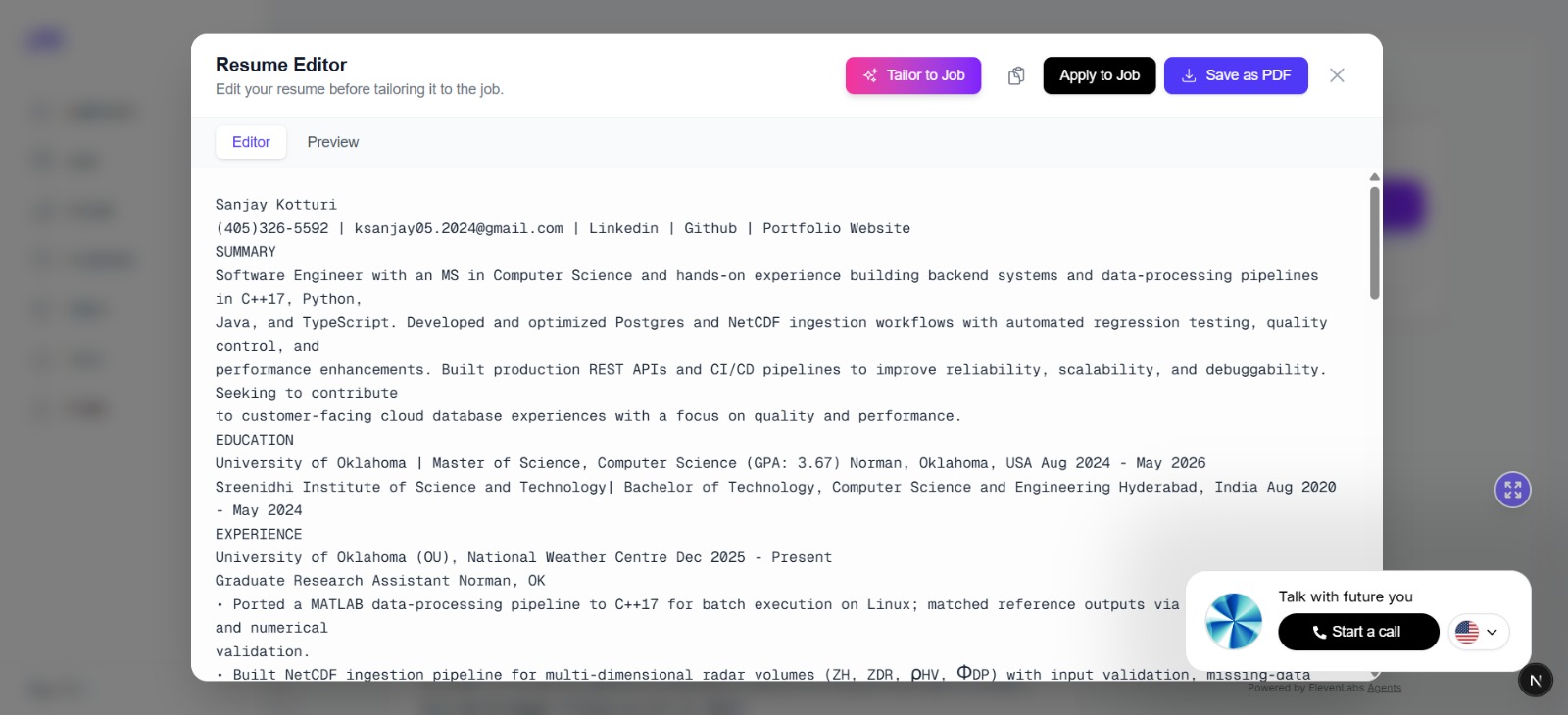 - Successfully automated resume tailoring without breaking LaTeX formatting.