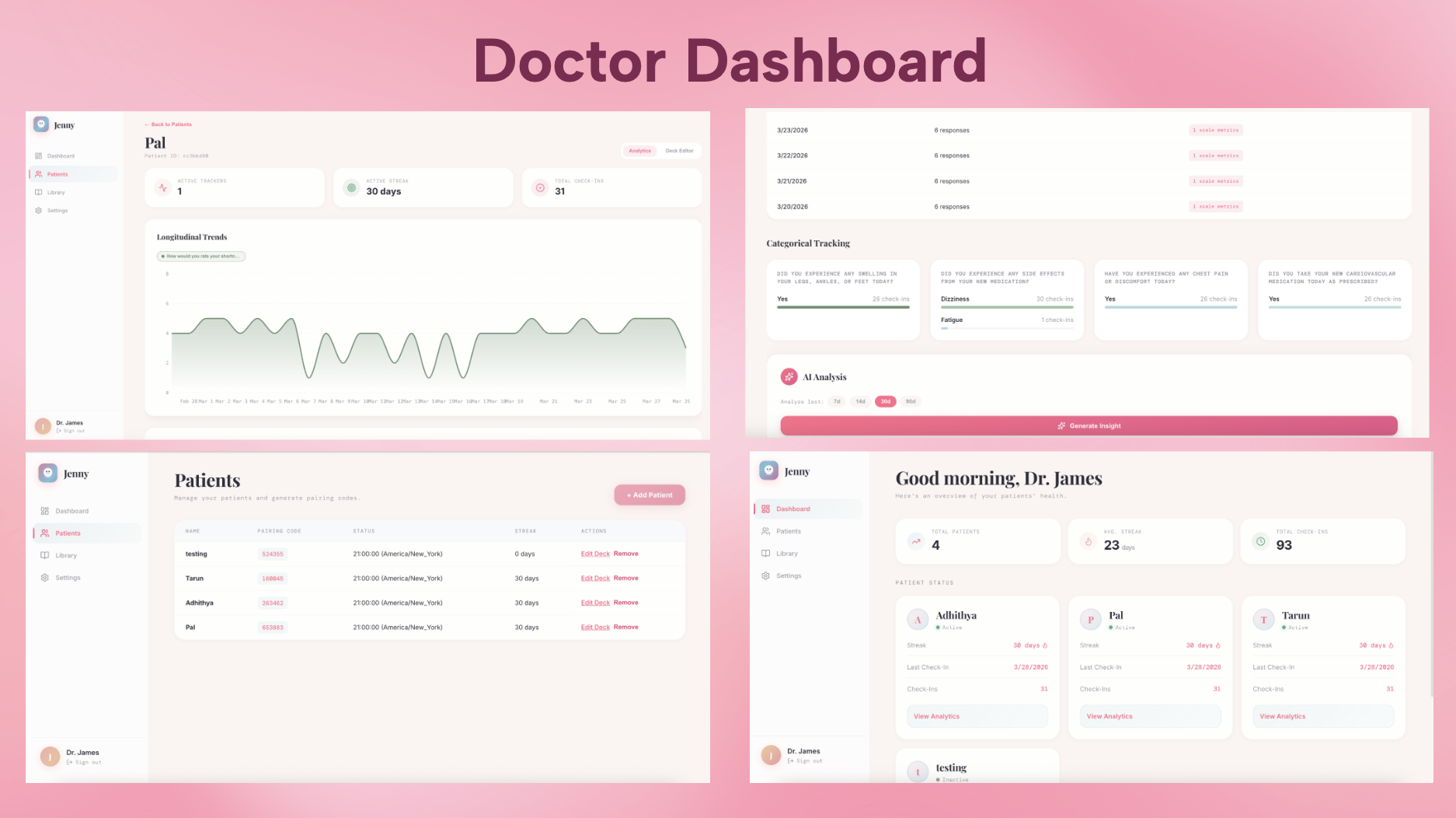 The next step for Jenny is expanding how and where patients can interact with it. The most natural addition is Apple Watch support, letting patients respond to their daily check-ins straight from their wrist without even opening their phone. We also want to explore passive data collection through wearables more broadly, pulling in metrics like heart rate, sleep, and activity automatically so doctors get a richer picture without putting any extra burden on the patient. On the doctor side, we want to build out smarter alerting so that rather than checking the dashboard manually, doctors get notified when a patient's responses cross a threshold worth paying attention to. Longer term, we think Jenny could integrate directly with EHR systems so that check-in data lives alongside the rest of a patient's medical record rather than in a separate tool