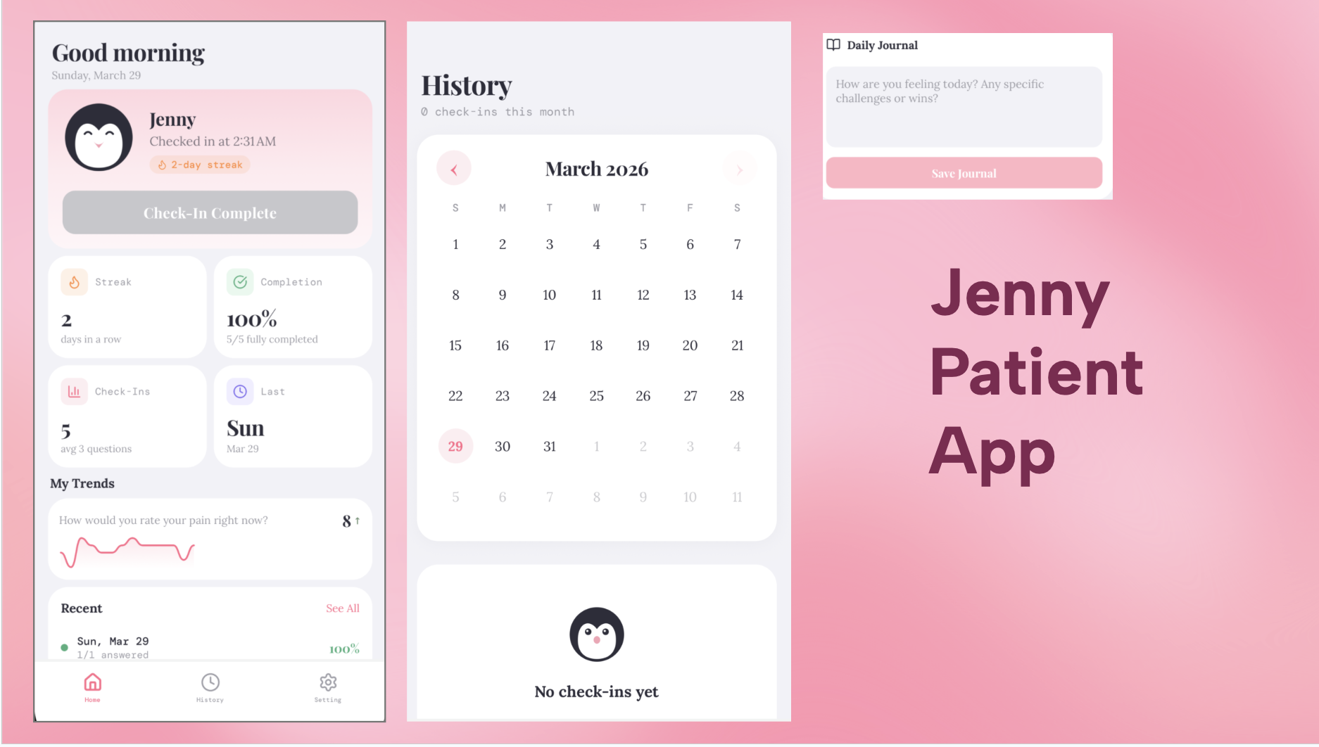 Honestly, the thing we are most proud of is how Jenny looks and feels. Building something that sits in the healthcare space without feeling cold or clinical was harder than we expected. We wanted patients to actually want to open the app, and that meant putting real thought into the visual design, the question formats, and the way information is presented. The heatmap grids and charts weren't just meant to be functional, we wanted them to be satisfying to look at. Getting that balance right, something a doctor trusts and a patient enjoys using, felt like the core design challenge of the project and we think we nailed it.