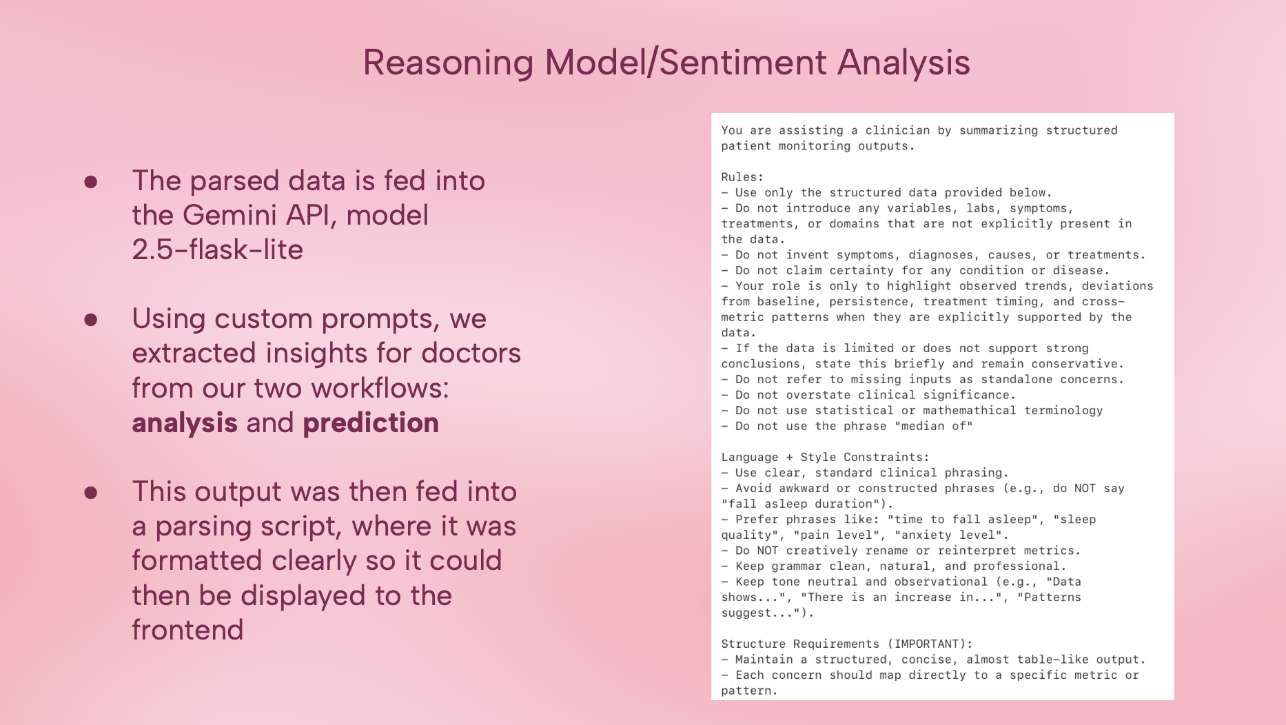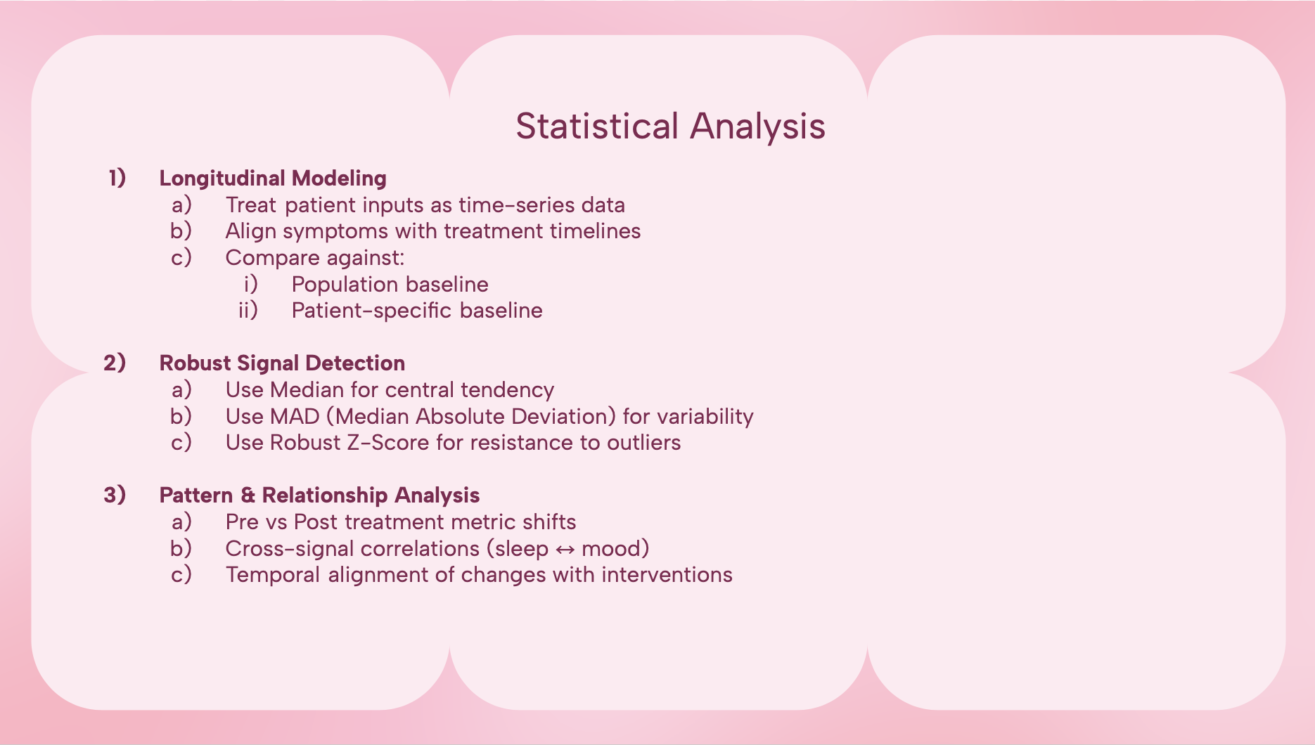 On the doctor side, the answers feed into a clean dashboard where trends and changes become easy to spot over time. If a patient's responses start shifting in a concerning direction, the doctor can see that before the next scheduled visit and act on it. The whole system is built around the idea that a few simple, well-chosen questions asked consistently can generate more useful clinical insight than a single comprehensive appointment once a year.