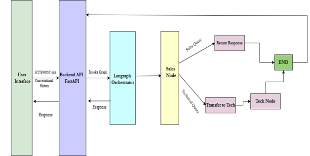 - LangGraph manages the decision flow. If a query needs technical help, the Sales Agent returns an action tag and the system hands the conversation to the Tech Agent.
