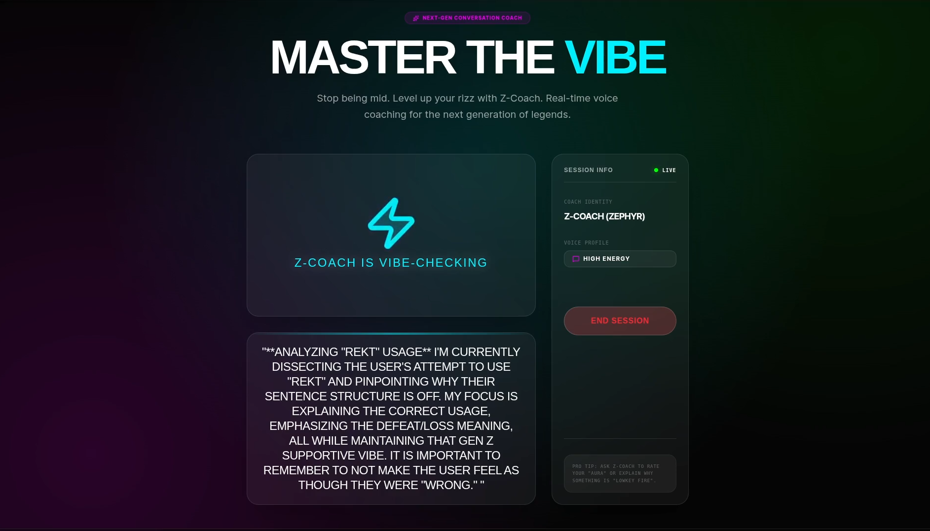 - Live Rizz Coach: A real-time voice agent (Z-Coach) that uses Gemini 2.5 Live to have high-energy conversations. It listens to your tone, slang, and "aura," providing instant feedback on how to sound more like a GenZ legend.