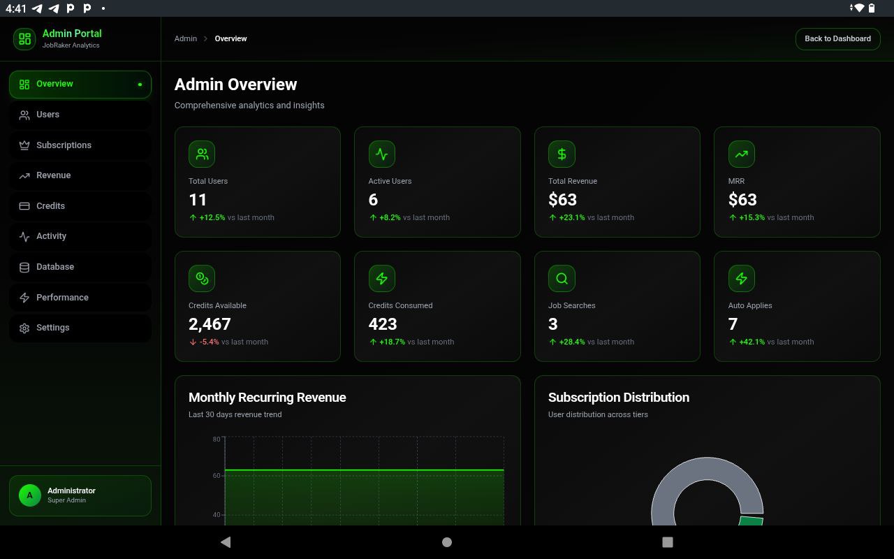 JobRaker is a fully autonomous job application platform that searches, filters, applies, and tracks jobs on your behalf 24/7.