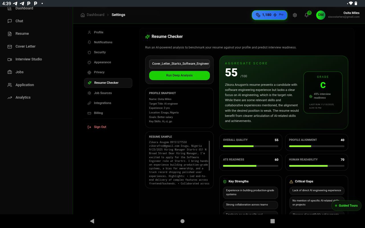- Provides AI career guidance, interview prep, and optimization insights