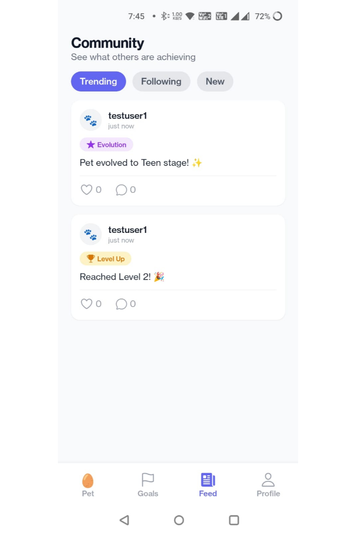 A built-in social feed automatically shares major milestones such as level-ups and evolutions, providing social reinforcement and motivation through visibility.