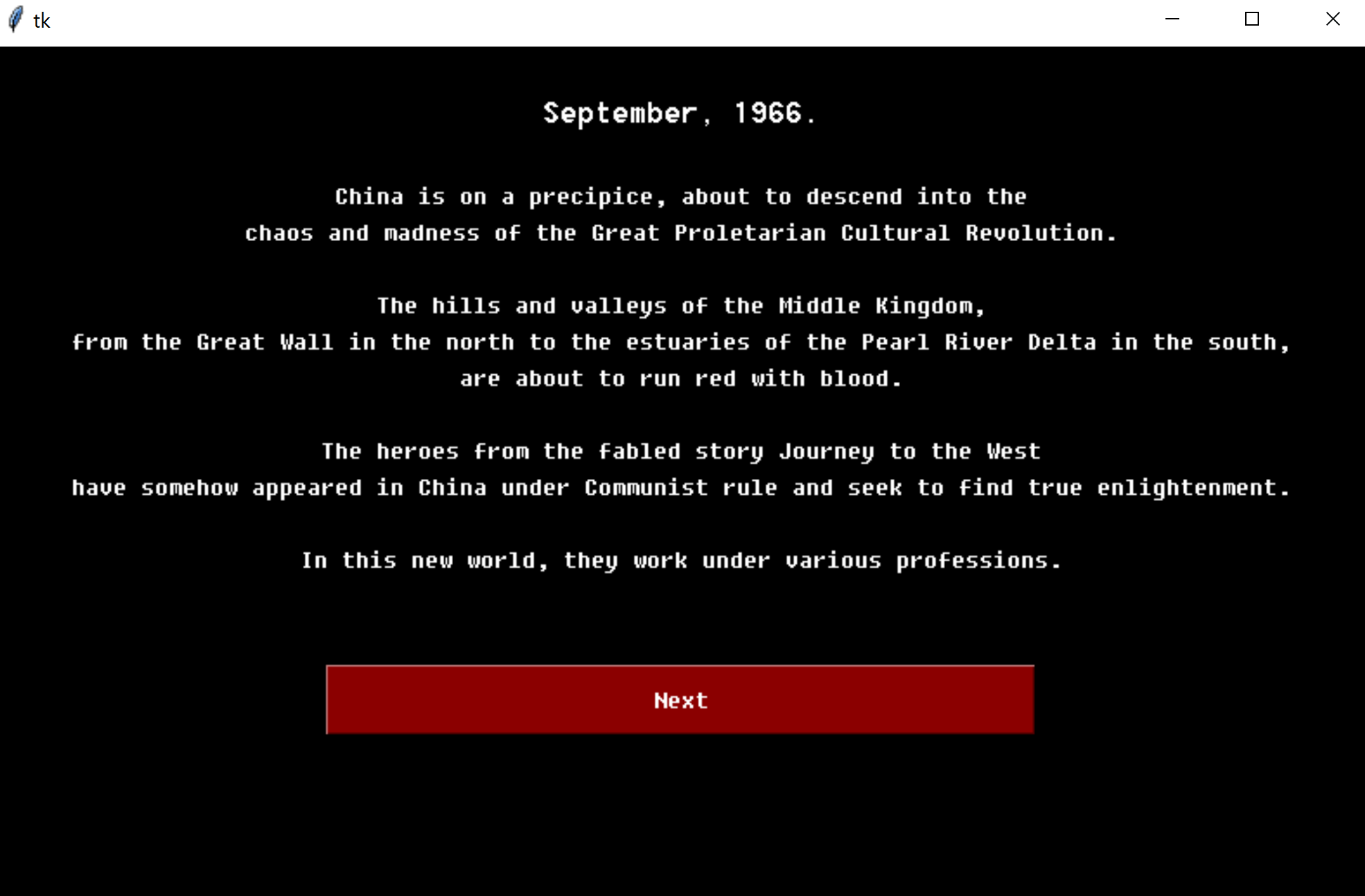 A couple of my friends and I were playing Dungeons and Dragons recently, and I had the idea of coding it out. As a lifelong RPG fan, I was excited to finally experience what it is like to create a game of this genre. My friends were also down to do a project on it, and what better chance to do it than at HackUCI? Our game's theme and setting are very interesting as we literally put together different concepts we brainstormed. Imagine the Monkey King from China's famous legend "Journey to the West" wearing designer clothing and battling his way through post-revolutionary Communist China. Funny references to all of these origins could be seen during game-play. Furthermore, the game's UI is designed to replicate retro games like Final Fantasy and Dragon Quest.It was a great experience for me to work with my friends on something that inspires us so much.My team members supported each other throughout the process by brainstorming crazy ideas and coding them out..