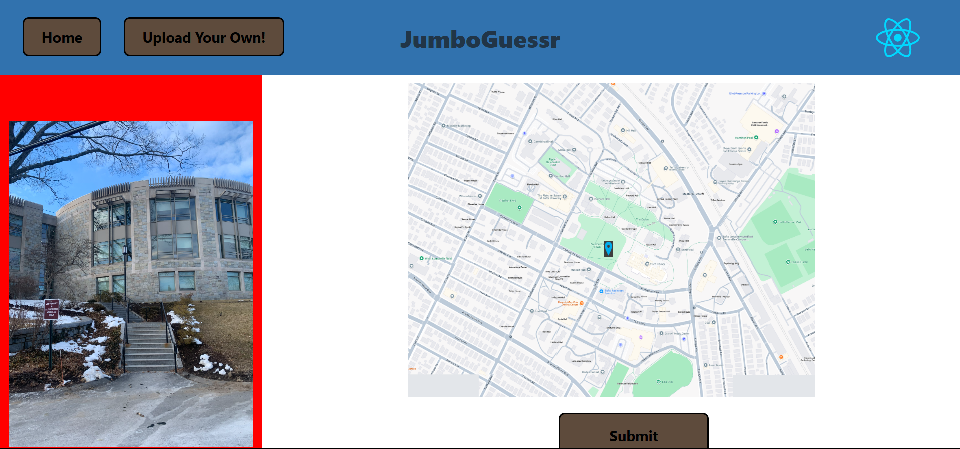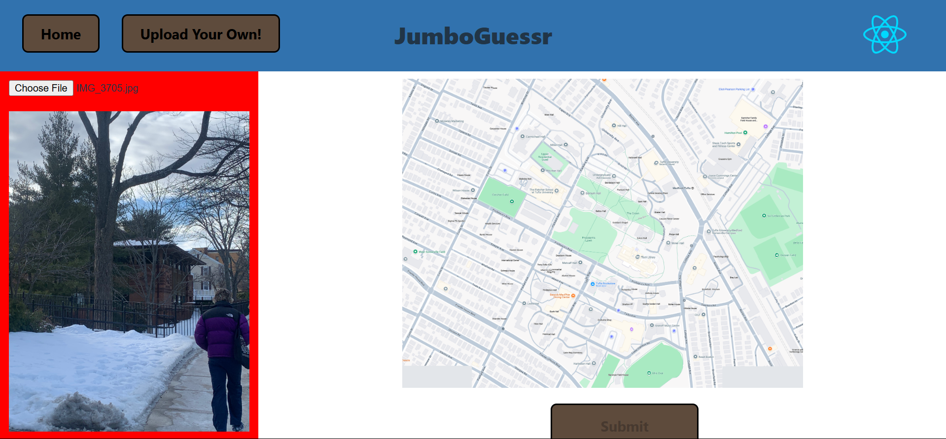 It's Geogusser! This project allows you to play a version of Geogusser that uses images that we took of tufts campus! After you guess a few phots, it gives you a score out of 100, depending on how close you were to the actual location. Furthermore, you can also upload your own images to our database, so you can play Jumbogusser with out own images!
