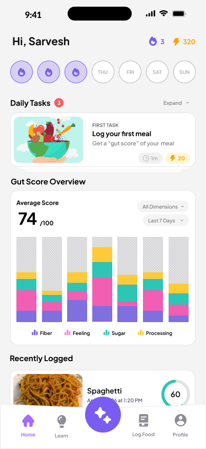 One of the biggest challenges was balancing simplicity with depth. Gut health data can get really complex fast, but the app still needed to feel easy enough for someone to use daily without thinking too much. Another challenge was figuring out how to integrate AI in a way that felt useful and not vague. We also had to keep redesigning the interface so it didn’t feel too medical or too playful, since it sits between healthcare and consumer wellness.