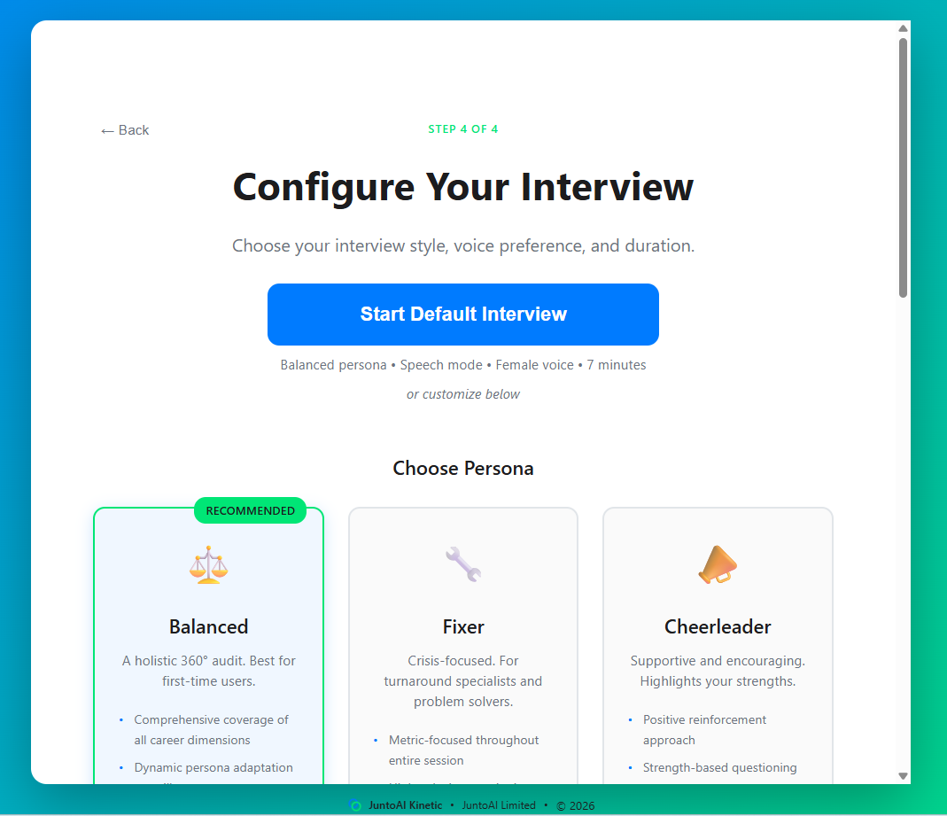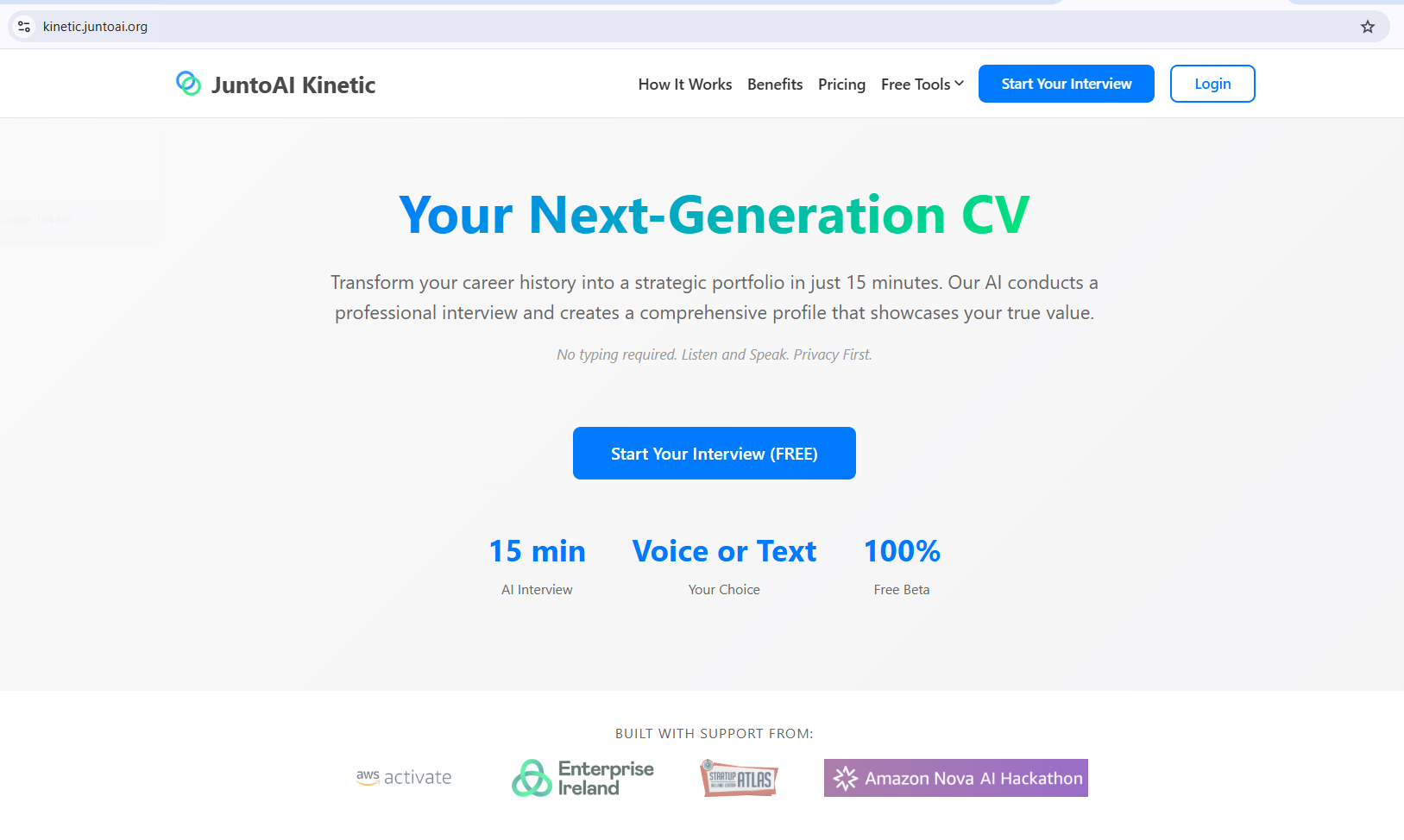 Kinetic is live at kinetic.juntoai.org. The interview engine, CV evaluator, and LinkedIn evaluator are all in production.