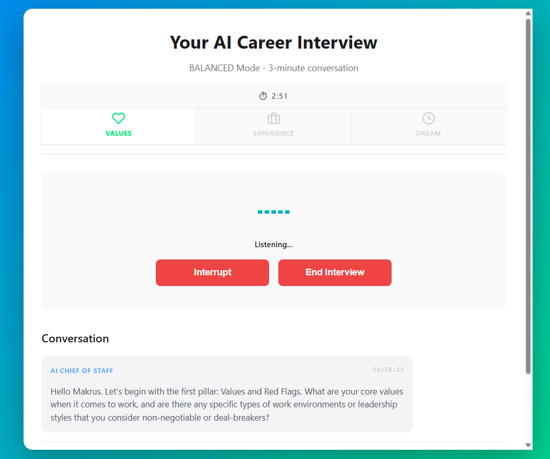 We asked: what if an AI could interview you like a sharp Chief of Staff, push back on vague answers, and extract the war stories, metrics, and values that actually define your career?