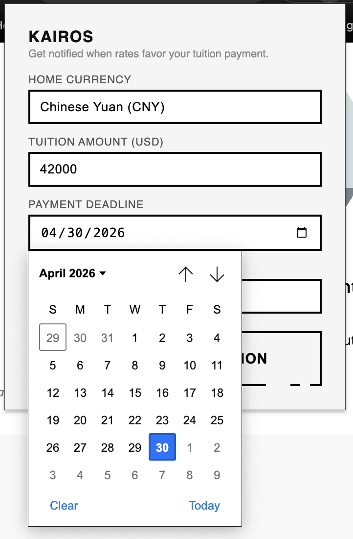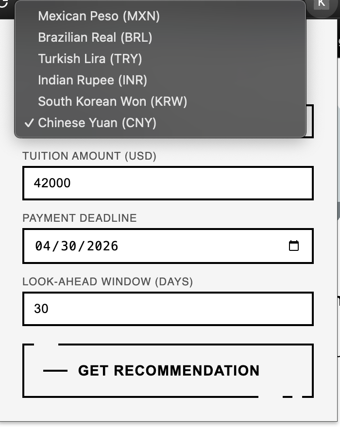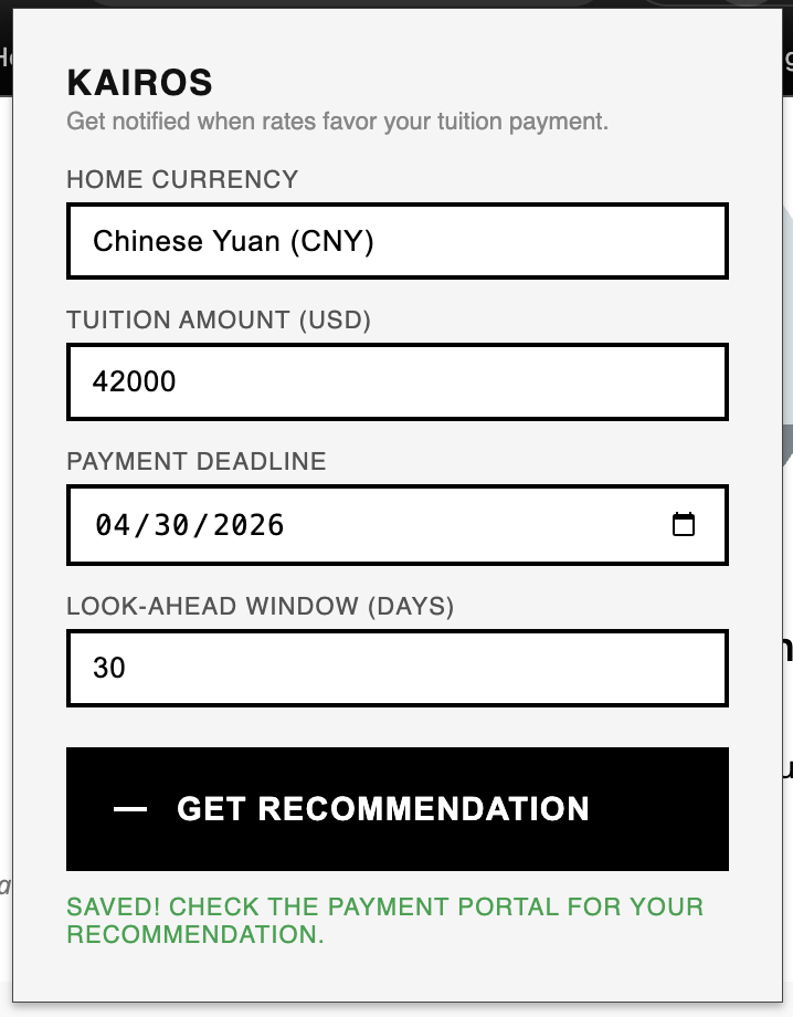 We built Kairos as a Chrome extension with a Python backend, keeping the stack simple enough to ship in a hackathon but real enough to actually work. The backend is a FastAPI server running a Prophet time-series model. When a user submits their settings, the extension calls our /best-day endpoint, which pulls historical exchange rate data from Frankfurter.app, a free, no-key-required API with clean daily rates going back years. We feed that history into Prophet, which handles seasonality and trend detection automatically, then forecast 30–60 days ahead and find the date with the most favorable predicted rate before the user's deadline. The savings estimate compares the cost of converting the tuition amount at today's rate vs the predicted optimal rate, expressed in USD so it's immediately meaningful regardless of currency. On the extension side, we used Chrome's Manifest, a service worker in background.js handles the API call and stores the recommendation locally, content.js puts a banner directly onto payment portal sites, and popup.html gives the user a clean settings interface. The trickiest part was getting the savings math right. Exchange rate direction is counterintuitive, whether a higher or lower rate is "better" depends entirely on which direction the student is converting, and we went through a few iterations before the numbers made sense end-to-end.