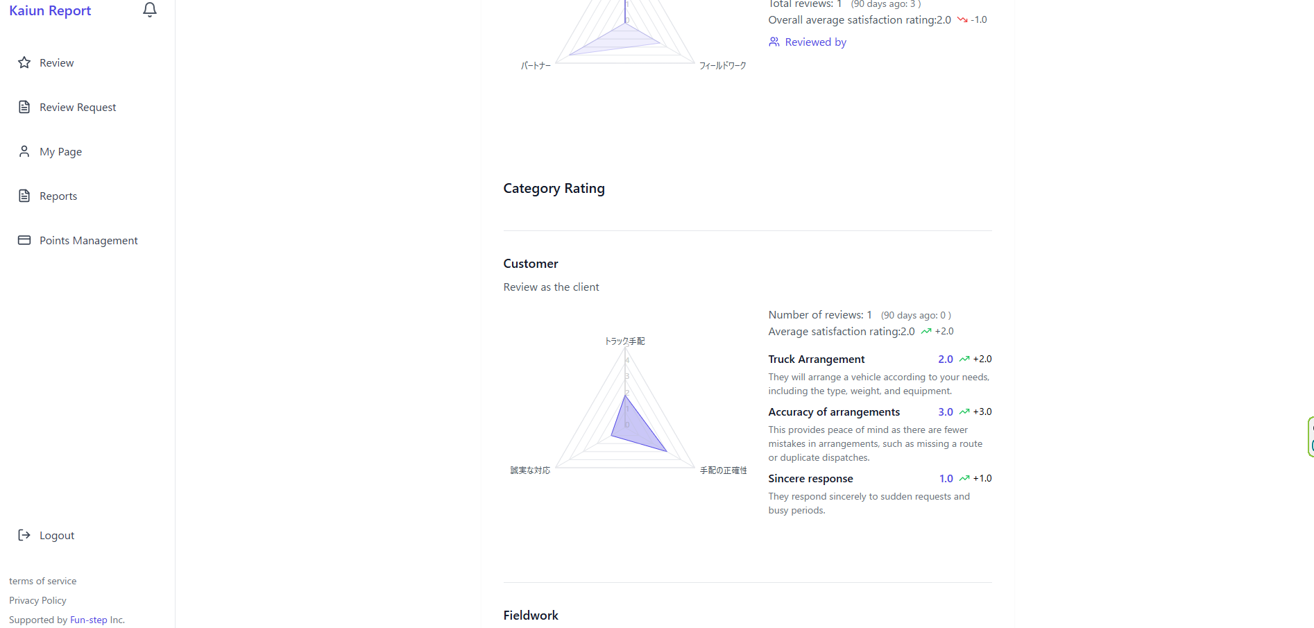 This gap inspired me to create Kaiunrepo (改運レポ), a specialized review platform where logistics stakeholders—shippers, receivers, and partner companies—can provide structured feedback to transportation companies. The name combines "Kai" (改, improvement) and "Un" (運, transportation), reflecting our mission to improve the industry through honest feedback.