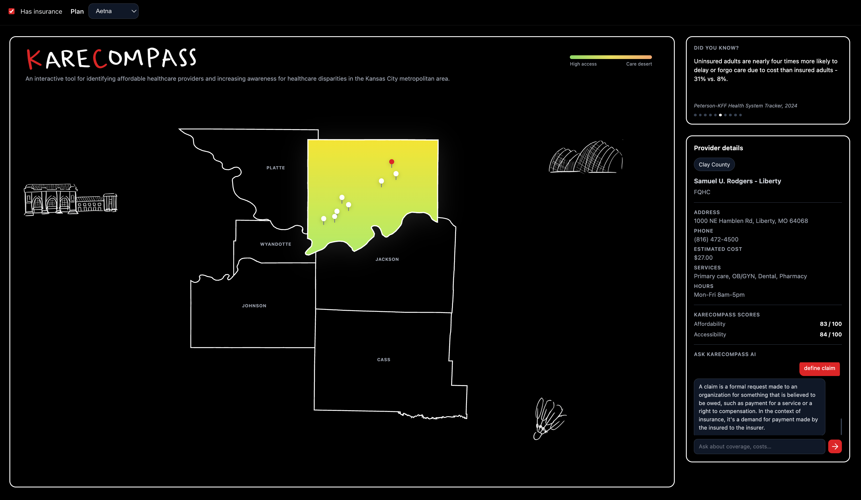 KareCompass is an interactive healthcare navigation platform centered around the Kansas City metro area. Users begin by selecting a county on the map, which highlights the regions and displays nearby providers as cost-labeled pins.