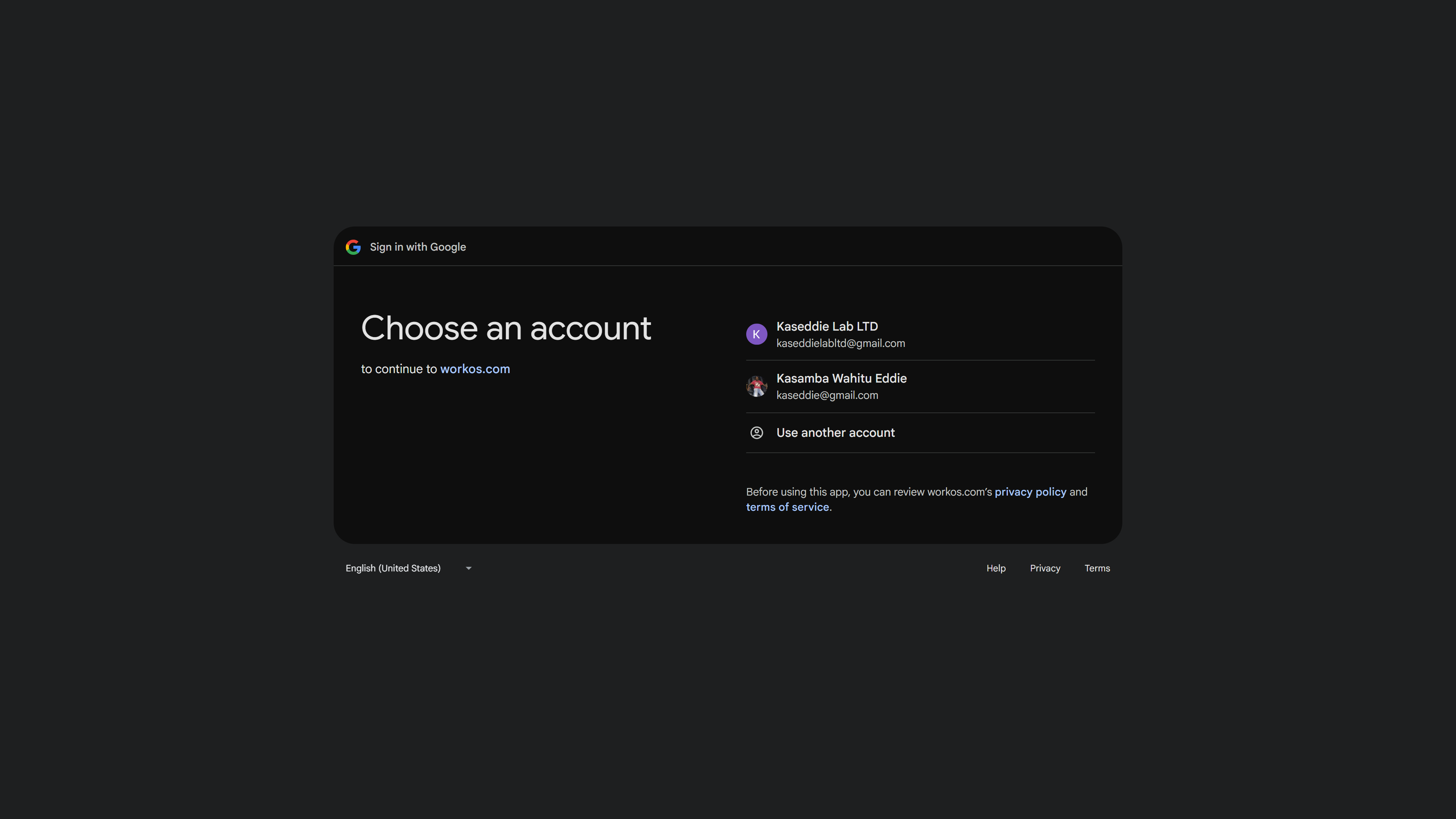 Google account selection screen. Choose an account to sign in and continue access to the workos.com application.