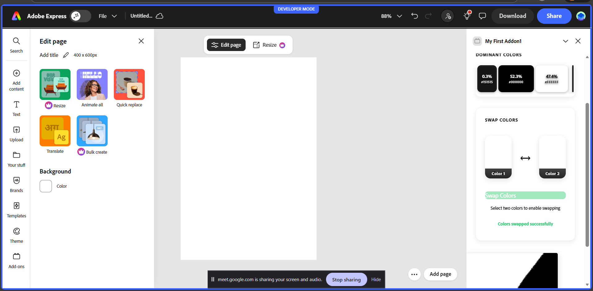 The add-on is built using the Adobe Express Add-on SDK with a JavaScript document sandbox. Images are analyzed using an HTML canvas to extract pixel data and calculate dominant colors and their percentages. A clean UI was designed using Adobe Spectrum Web Components to ensure consistency with Adobe Express. The color-swap functionality works at pixel level, replacing one dominant color with another while preserving the image structure.