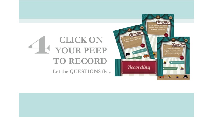 Question/Recording Screen: To record, press and hold your child’s puppet and ask the question and enjoy the good conversation that follows.