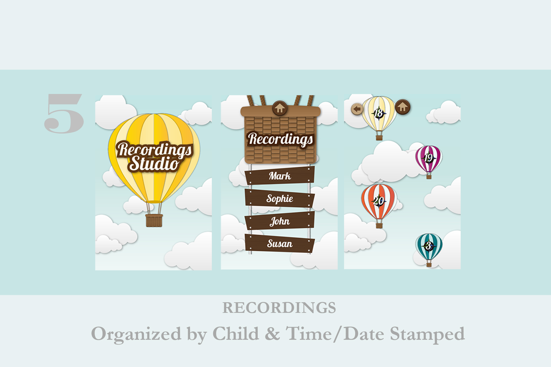 Recording Studio: Each recording is time and date stamped in the child’s “recording studio”.