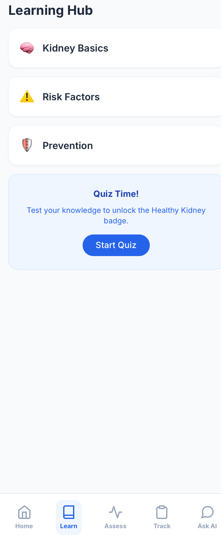 - 🧠 Educational Modules: Interactive lessons about kidney health, CKD risk factors, diet, and lifestyle.