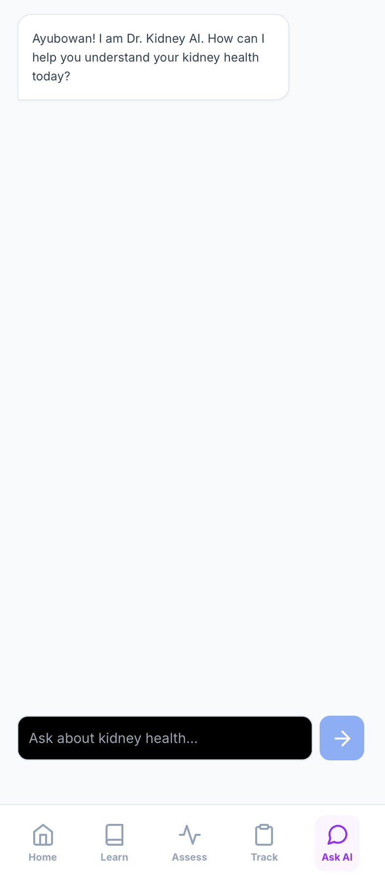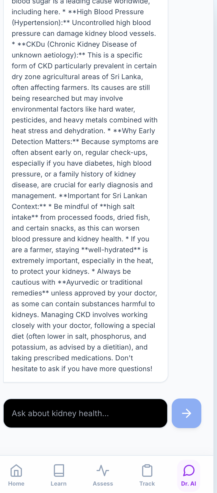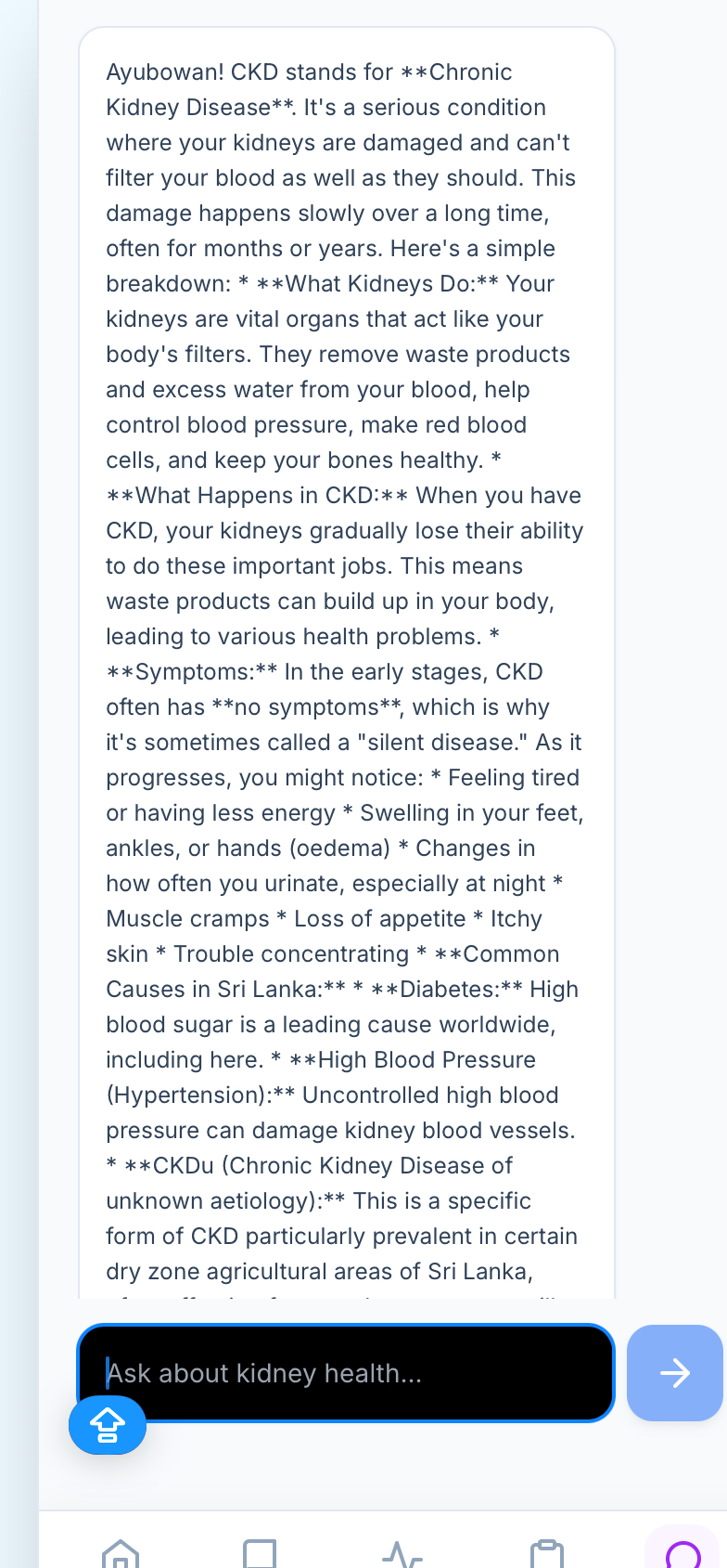 - 📊 Early Detection: Allows users to log simple health metrics (e.g., urine color, blood pressure, creatinine levels) to receive AI-guided feedback.