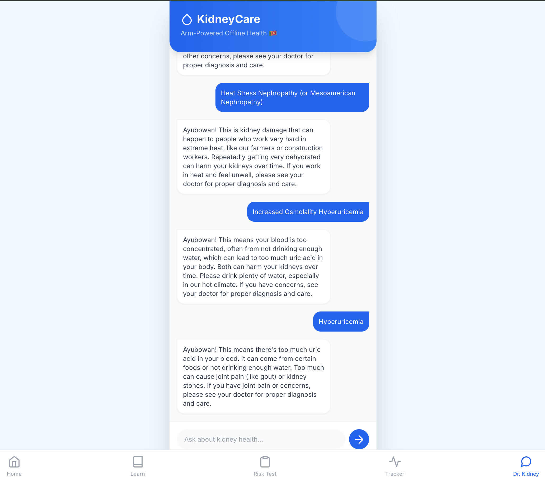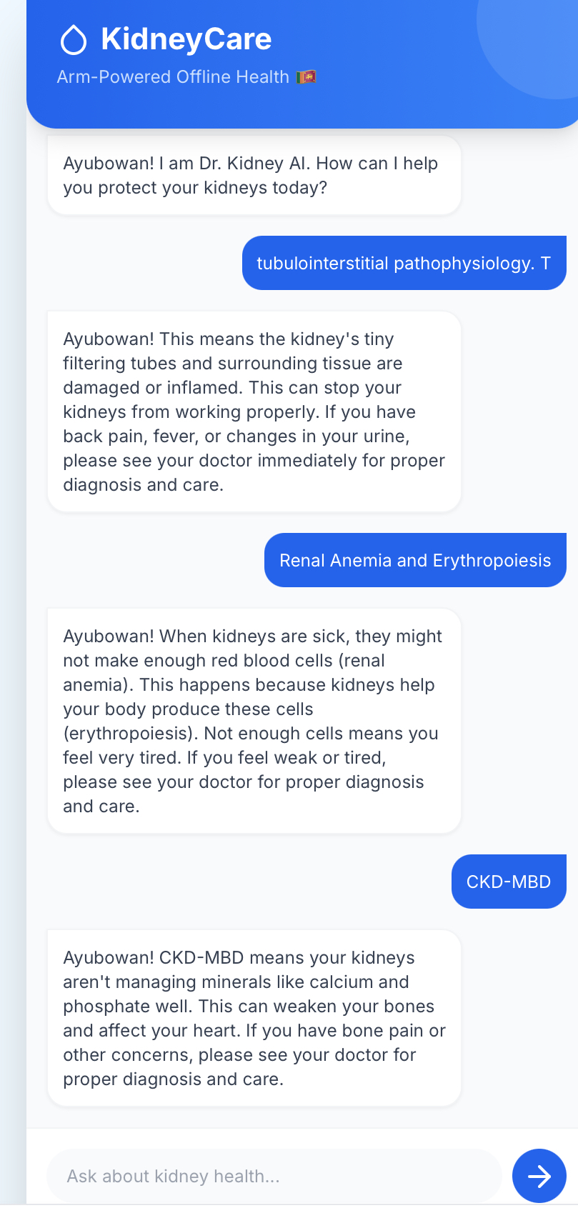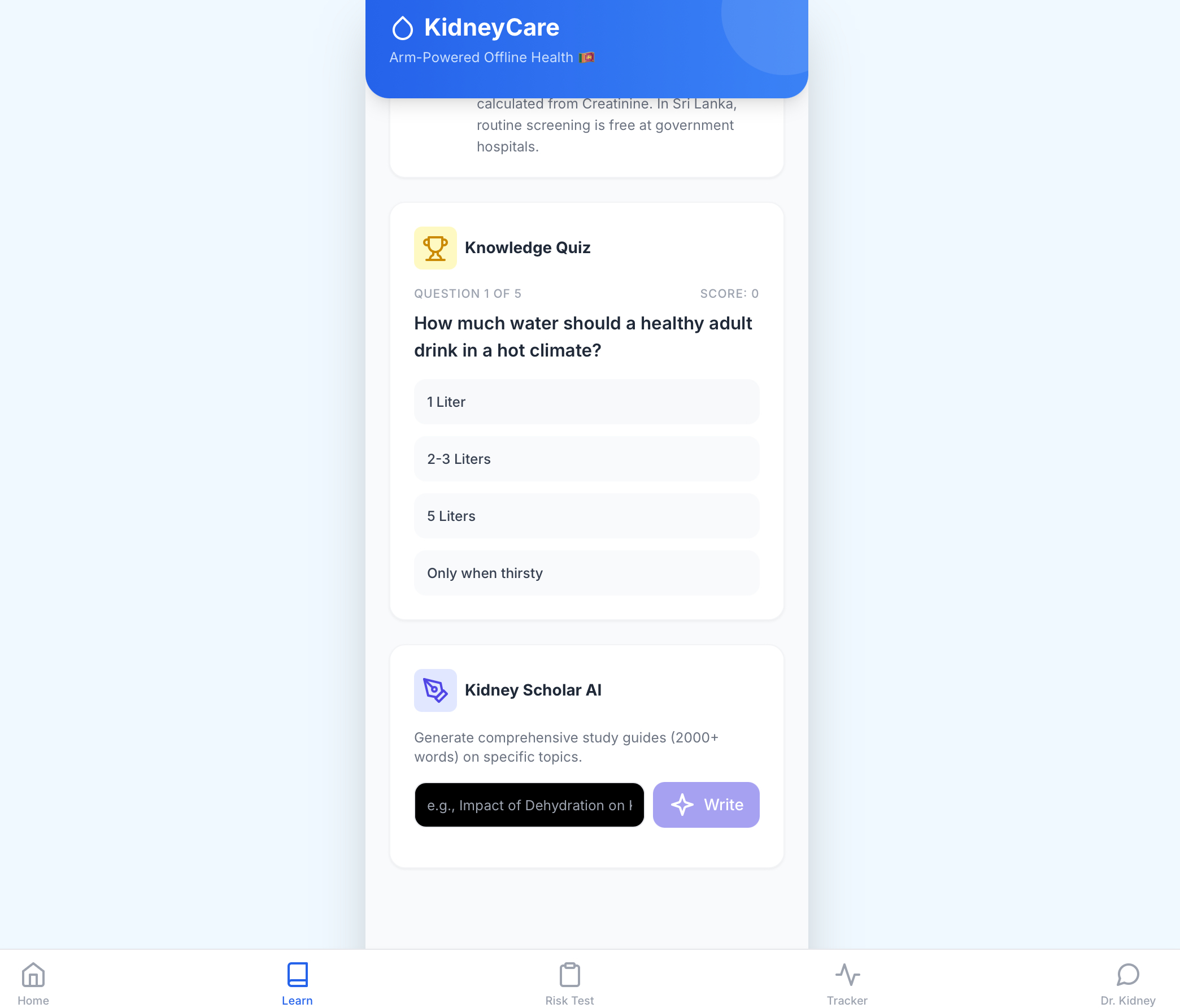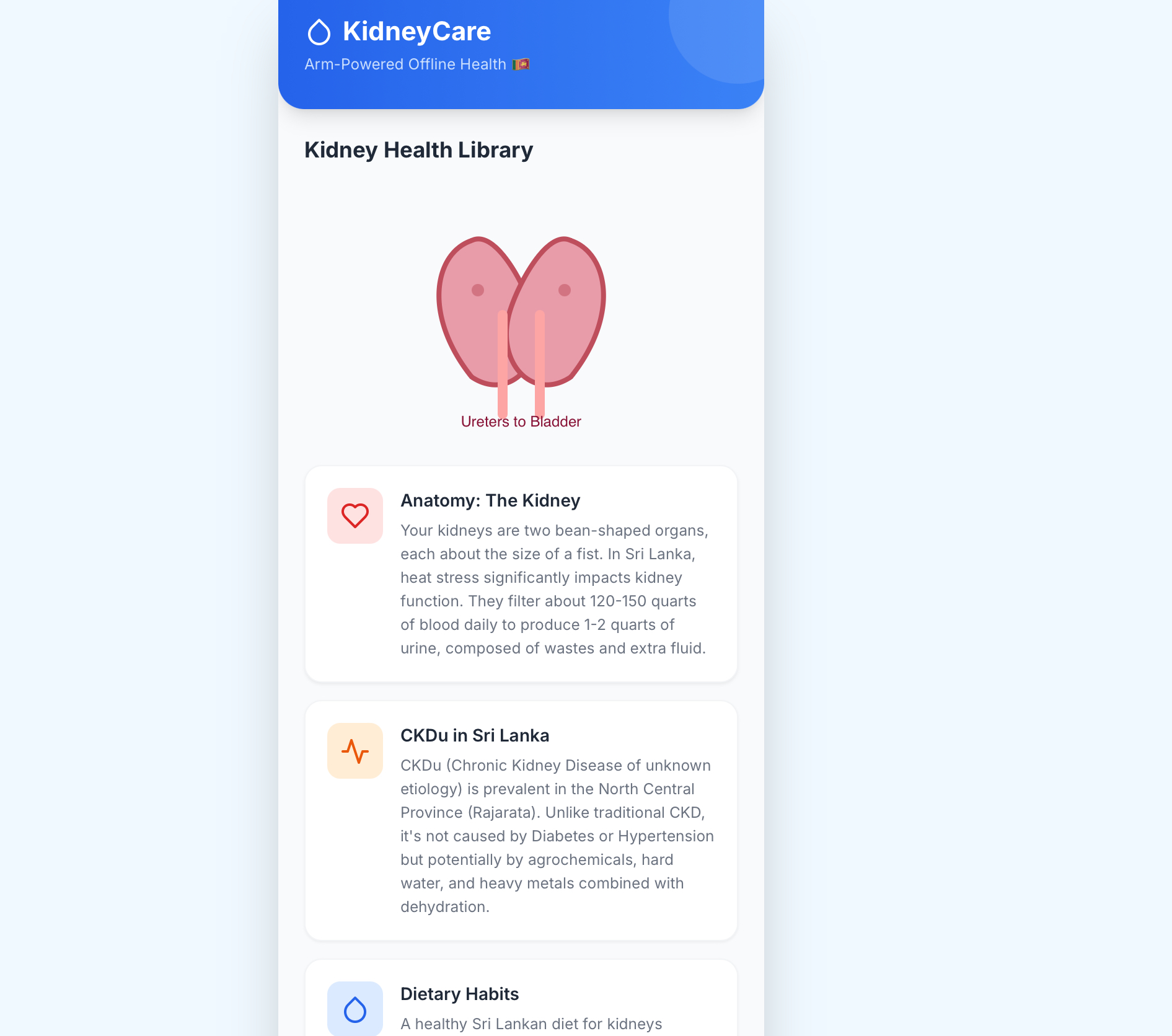Chronic Kidney Disease (CKD) is a growing health concern in Sri Lanka, especially in rural communities where early detection and awareness are limited. Many patients are diagnosed at advanced stages due to lack of accessible screening and education. KidneyCare was inspired by the idea of using AI to empower individuals with knowledge, early detection tools, and actionable prevention tips—all through a mobile platform that runs offline on Arm-based devices.