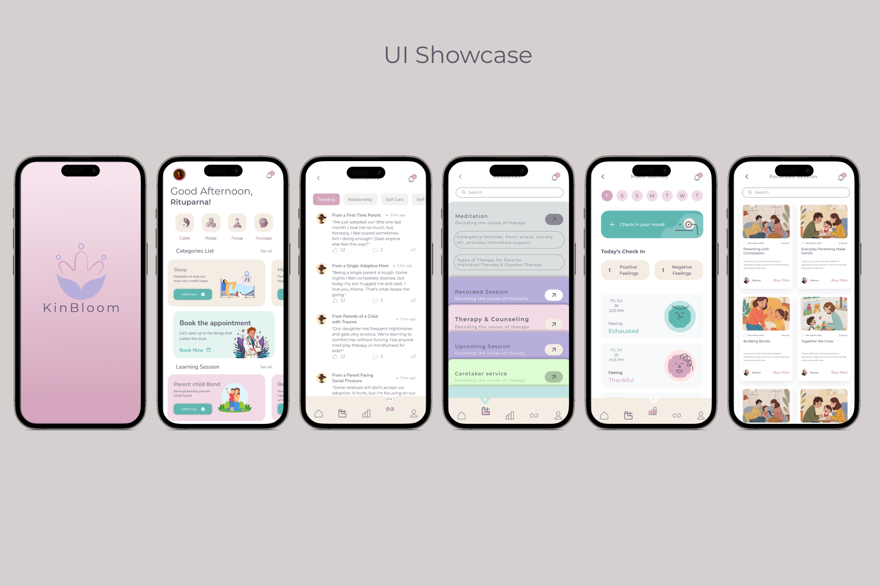Kinbloom was developed through a human-centered design approach, starting with research on adoptive parents’ emotional challenges. Insights from secondary data, expert interviews, and behavioral studies shaped the concept. Using Figma, moodboards, and UI iterations, we crafted a calm, trauma-informed interface. The design process emphasized empathy, accessibility, and emotional safety at every step.