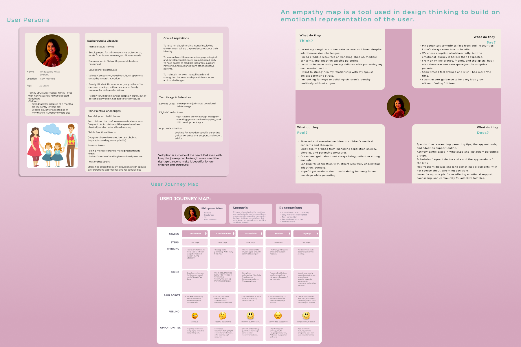 One major challenge was addressing the deeply emotional and sensitive nature of adoption without triggering users. Translating psychological insights into simple, comforting design interactions required careful tone and visual balance. Limited real user data also made validating emotional responses difficult, so secondary research and expert input became essential for accuracy and empathy.