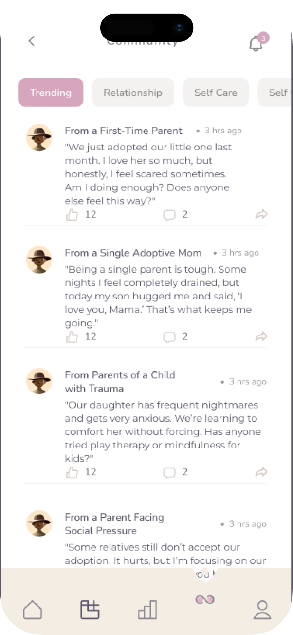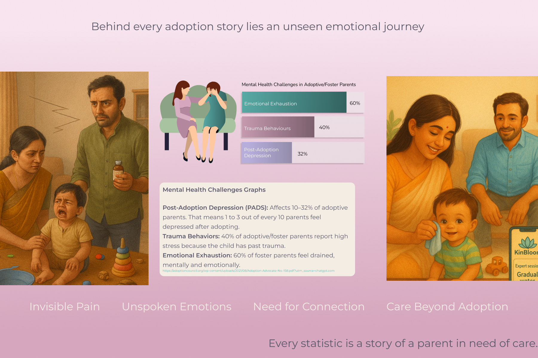 Kinbloom was inspired by the silent emotional struggles adoptive parents face after adoption—grief, anxiety, and self-doubt often hidden behind smiles. Research showing over 30% experience post-adoption depression revealed an urgent need for support. Kinbloom symbolizes family and growth, creating a compassionate space where parents heal, connect, and help their families truly bloom.