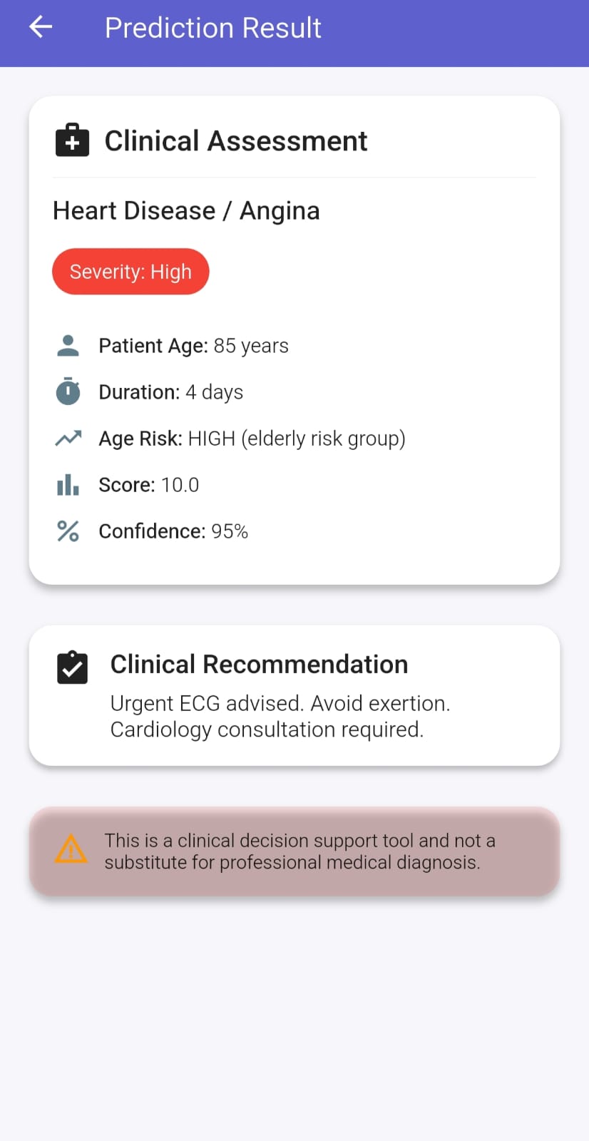 • Successfully built a fully functional end-to-end medical triage app • Implemented dynamic risk, severity, and confidence scoring • Designed a clean and intuitive user interface • Created a foundation that can scale to ML-based predictions • Delivered a complete working product from concept to deployment
