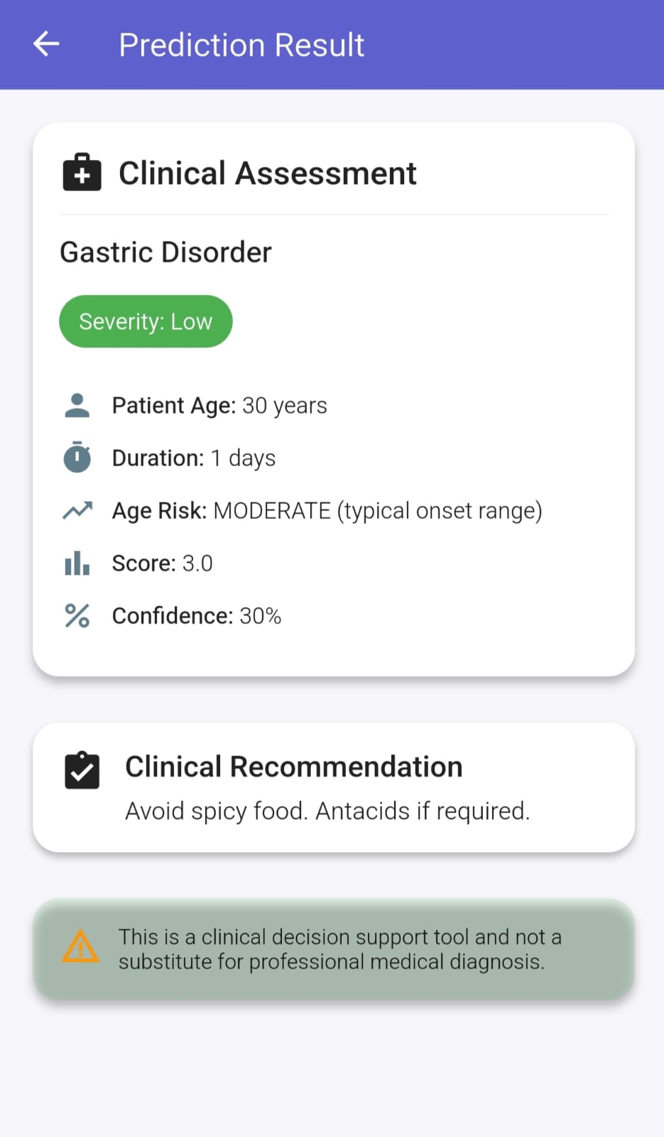 The application was built as a cross-platform mobile app with a clean, modern UI and a rule-based clinical logic engine. Key highlights: • Modular architecture for scalability • Age-specific disease risk evaluation • Dynamic severity and confidence calculation • Structured medical logic for reliable outputs • User-friendly design focused on clarity and accessibility The system is intentionally transparent and explainable, making it easy to extend with machine learning models in the future.